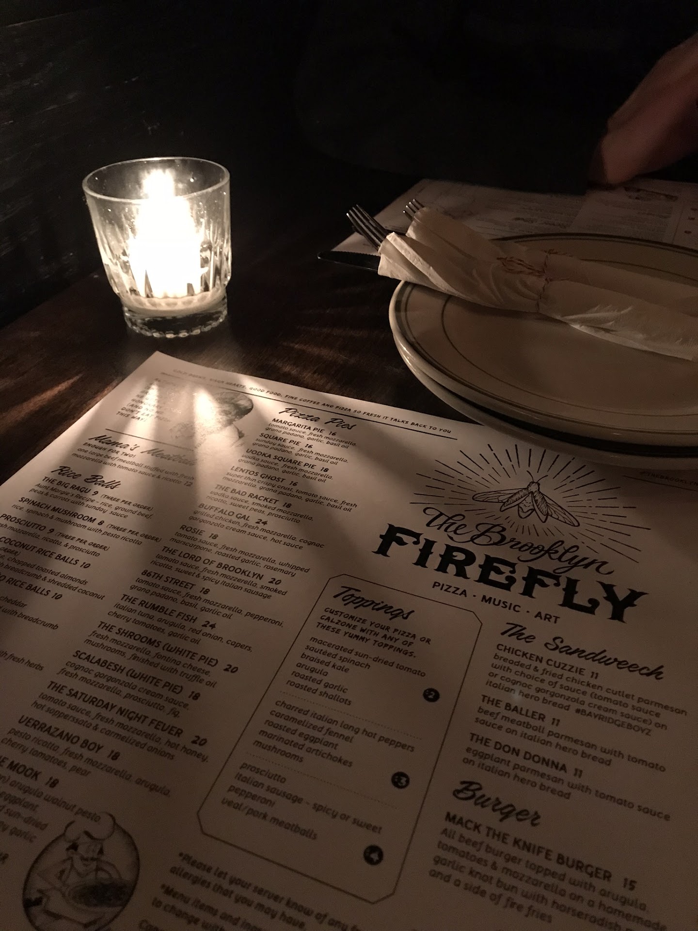 Ā Ā Ā Read moreThis place is beautiful. Its not everyday we find a place great for a fun night out right in the middle of Bay Ridge Brooklyn. A beautiful place for live music, date night or friend night or group night. My husband and I are so impressed by what they have to offer and the ambiance. We order our food for a romantic night at home once a month we dont feel like cooking and we love to treat ourselves to Firefly. First off every single pizza you get- is spot on. Dont even consider not liking it even if its ingredients you arent used to. The high quality and out of this world taste of the combinations on every pizza will WOW you. You quite literally cannot go wrong. They have respect for their food thats why its like this. Beautiful! The rice balls as well are delicious. Big luxurious rice balls with a crispy outside and a melt in your mouth inside. We tried the spinach mushroom and my husband who hates mushrooms loved it. Im telling you you cannot go wrong w this place. On the side is a lucious pesto ricotta. Ricotta never tasted so girl and this is coming from someone whos mom cooked lasagna every weekend. The pic on uber has (and uber said firefly submitted the pic) had sauce but this didnt ...but eh it is what it is. So what lol The only thing Id say we were laughing a little about was the meatball. Its 14 dollars, not giant as advertised, almost no mozzerela in it even though its advertised to be oozing out of it, and its more of a 3 dollar meatball in foodtown. We were laughing lol. The pizza is expensive 30 a pie but worth it! Gourmet pizza! But this meatball was missing its insides for 14 it was quite the joke of the night. Other than that amazing. Dont order uber cause it gets cold quick but if you are picking up or dining in this is your...