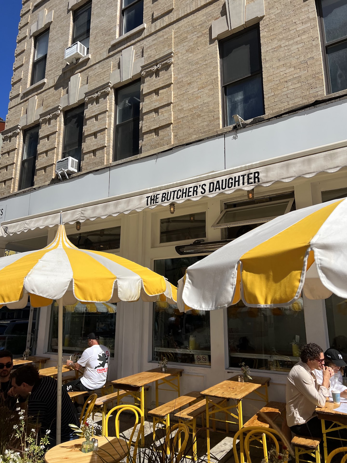 Upon arrival, we were met with a beautiful exterior and outdoor patio engulfed by yellow and white striped umbrellas. The chairs were also the same yellow, and the wooden tables outside weren't from Ikea if you know what I'm saying. This attention to detail continued to the interior. Fairplay, Butcher's Daughter.