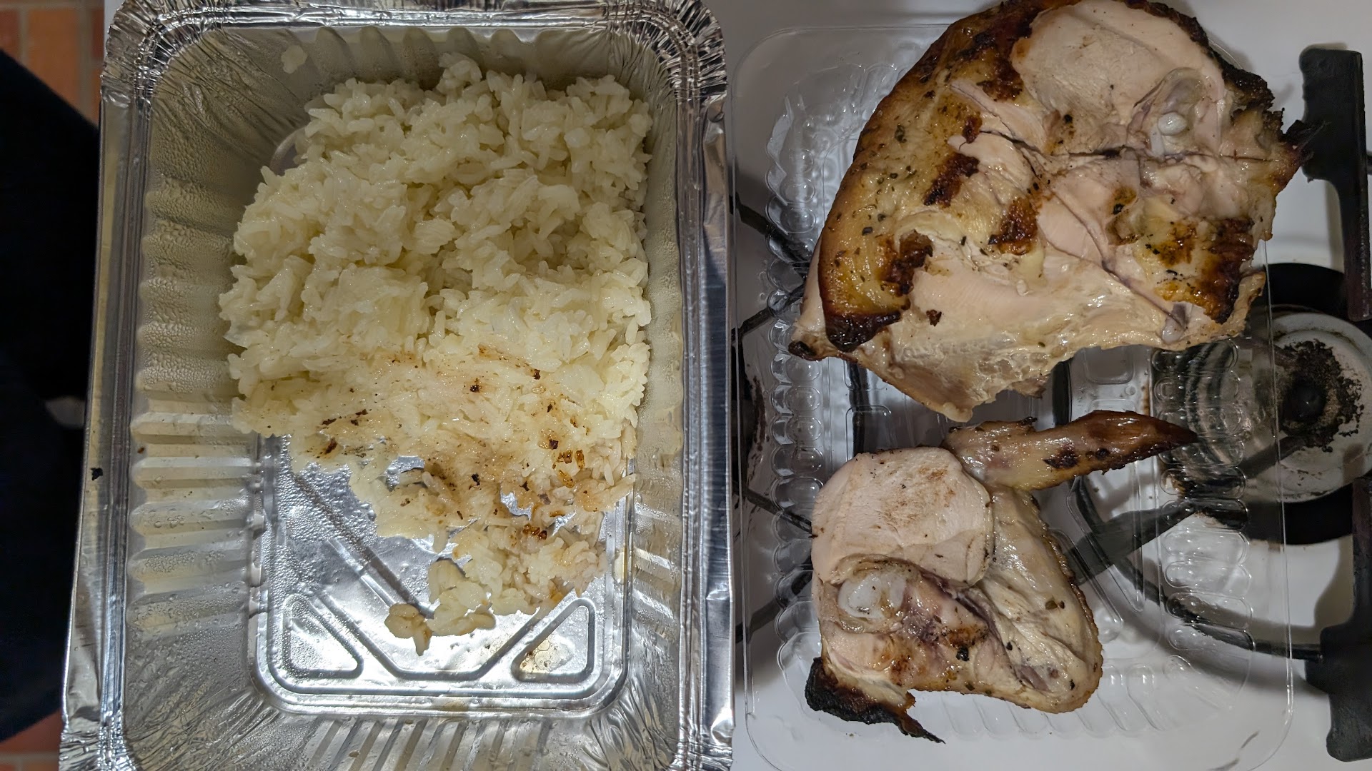Read moreThis evening (10/25/24), I ordered the 1/2 chicken value meal ($13.49 plus tax) which comes with one side (I ordered rice) and pita bread. I walk into the restaurant to pick up my food and the worker behind the counter is looking at me weirdly and has a really bad attitude. My bag feels light and I open it up and its a 1/4 chicken and there is no Pita bread (see photos). I told the worker that I think there was a mistake and he tells me that he gave me 1/2 chicken and they ran out of pita bread. The guy was very hostile and kept insisting it was a 1/2 chicken and I decided it wasn't worth arguing and I was hungry so I just took the food and left. What makes matters worse is that the chicken was dry and had no taste. Additionally, the rice was overcooked and mushy. I will never go there again and my advice is to stay far away...