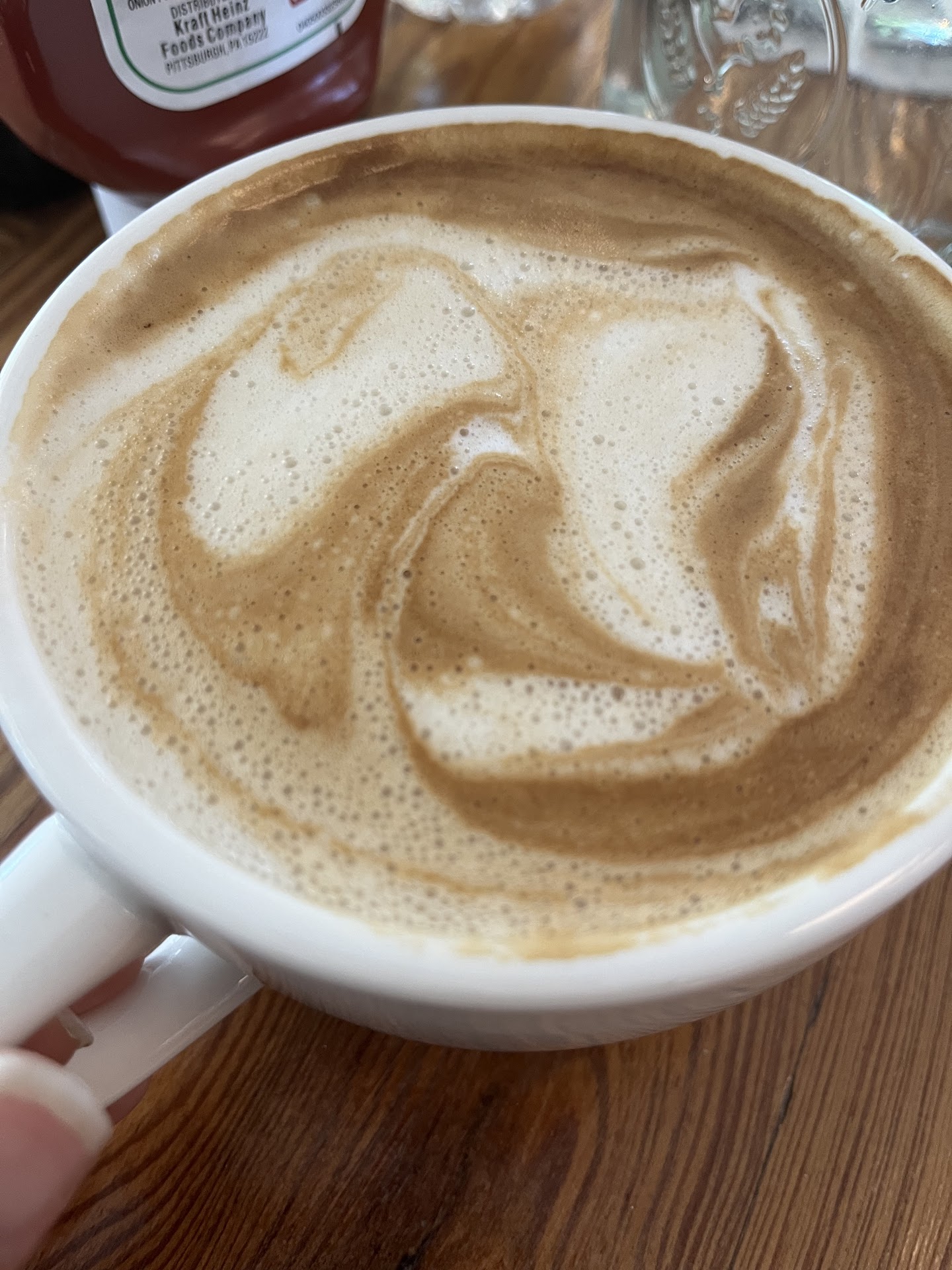 We were pretty full but had already ordered a skillet pancake to split. It was delicious. Very soft, almost like cake. The bottom was crunchy from being made in a skillet. Just a little drizzle of icing and some cinnamon crumble was the perfect topping. And the pistachio latte "slaps", according to my Gen Z friend.