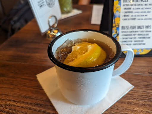 Despite an atrocious Old Fashioned the prior weekend that made me dramatically declare I was done with bourbon, all of the hipster leather wore me down and I went with the Craftsman Campfire, conveniently served in a campfire mug. My chum side-eyed it a bit, concerned it was going to be served hot, but it was thankfully a cold beverage that provided a refreshing boost on a muggy summer day. My initial reaction was a little negative - the first few sips tasted like bland iced tea, and I'm not sure why. Maybe it wasn't blended entirely? I didn't really taste the referenced fall flavors (cinnamon, apple, etc.), but once I dropped the lemon garnish in and mixed it around, everything was solid.