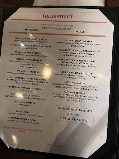 Read moreI was a little concerned about dining at this pub after reading some of the reviews that spoke negatively about the food and how some customers were treated, but my visit yesterday was a total delight. I had the lasagna and it was delicious. The birthday girl had the stuffed chicken and found it yummy. Another friend had the fish and chips and really enjoyed it. Another had the crab cakes and said they were very good. I don't recall what the three other people in our party had to eat, but everyone said they really enjoyed their meal. (And, by the way, the food was reasonably priced) Our waiter -- Reza was absolutely terrific! He offered excellent suggestions, was solicitous and patient, took our picture, and chose two scrumptious desserts that he carried in as he led us in singing Happy Birthday. The decor is quite attractive and well-suited to the fare offered. There are multiple TV screens to watch sports and the noise level is what one would expect at a well-populated venue such as this one. We had the birthday girl's Mom, who is well into her 90s and in a wheelchair, sitting at the head of the table and every effort was made by Reza and the rest of the staff to make sure she was comfortable, not only with the seating arrangements, but with the consistency of her food. We were all treated with courtesy, respect, kindness, and genuine friendliness. So, I would have to say that whatever deficits might have existed in the past, as per the reviews of other patrons, clearly have been addressed and most successfully remedied. Extra kuddos to The District for that and do keep up the fine work. I look forward to...