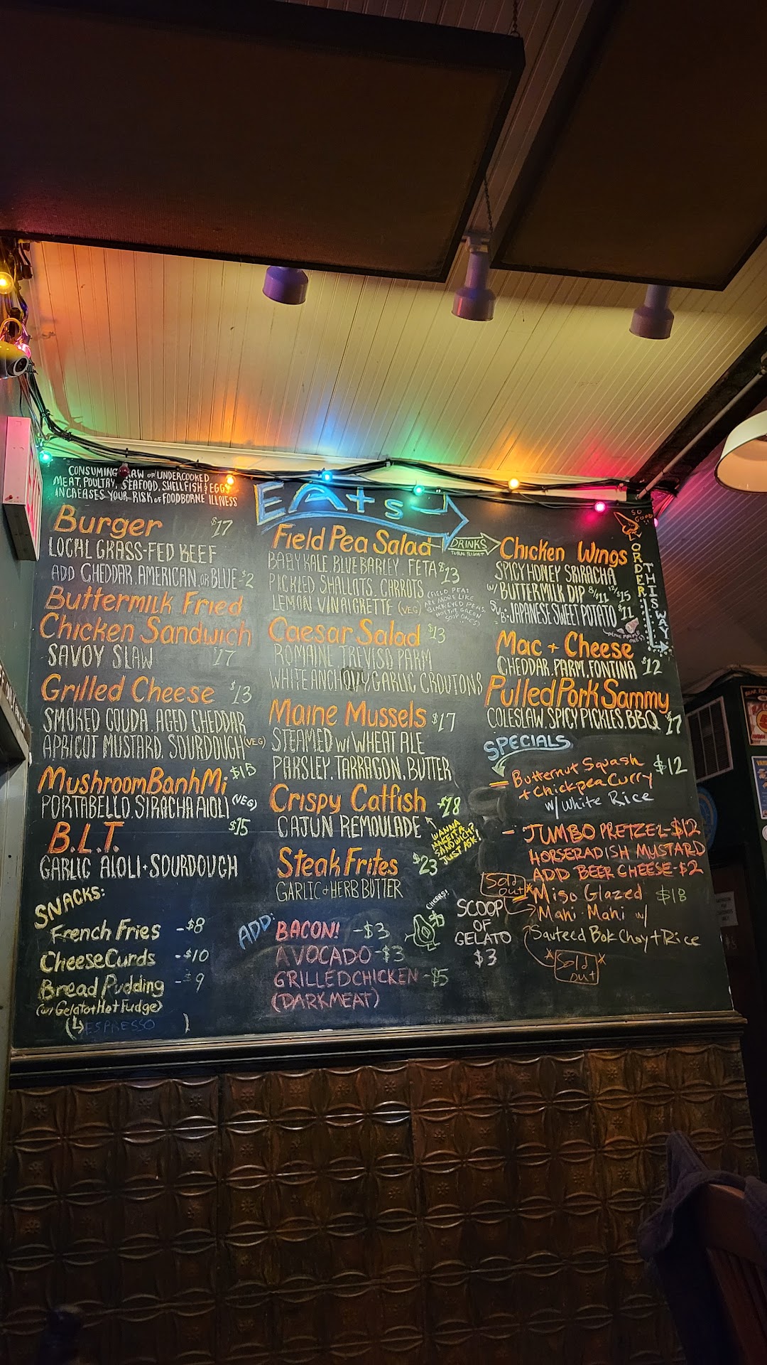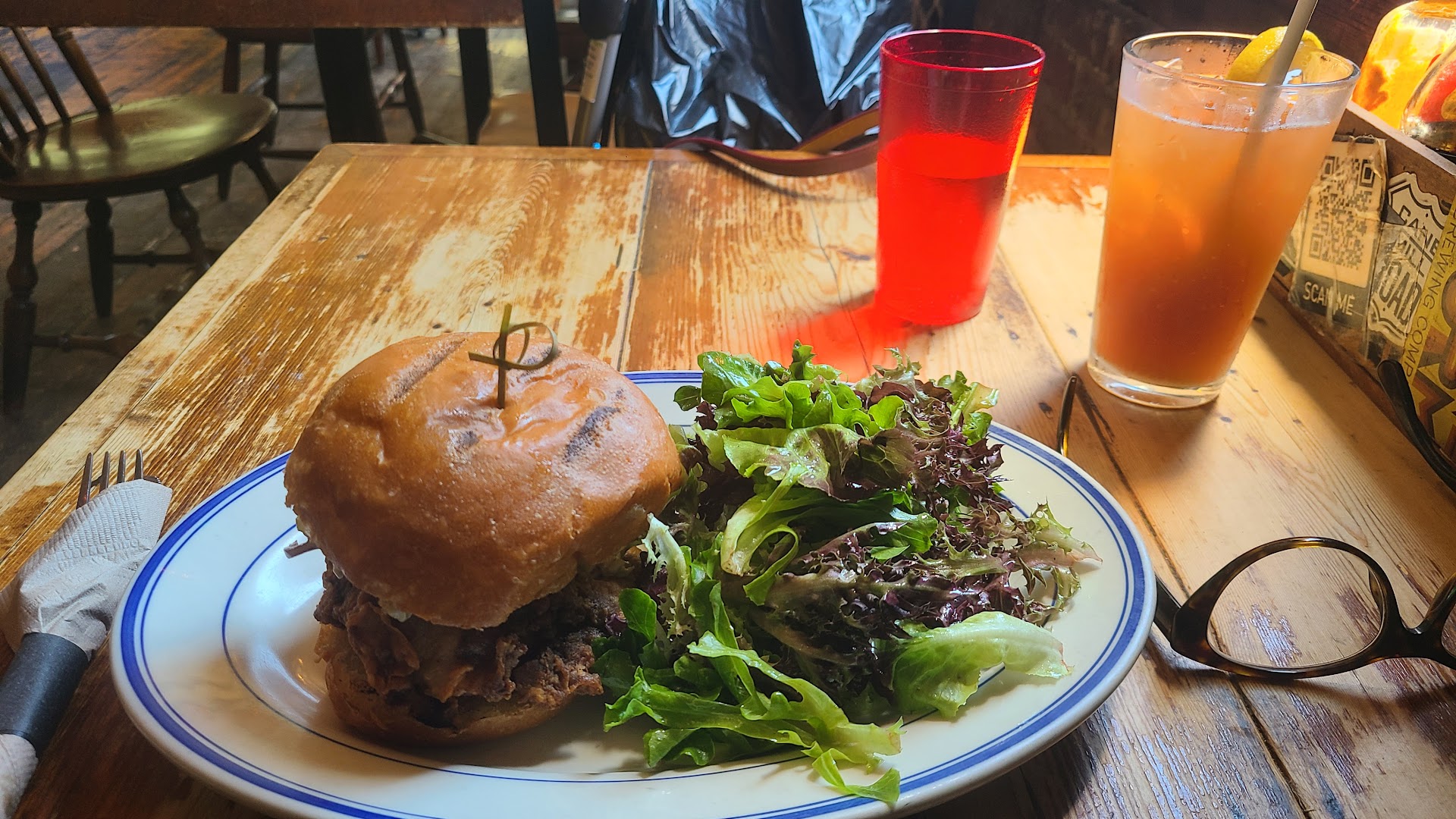 The food (cash only) is pretty great, from what I have had. The portions leave you feeling like you got your money's worth, and the quality of food is high. I have tried the burger (was juicy and tasty), the catfish sandwich (very good but spicy), and the pulled pork sandwich, which had a very nice sweet tang taste that impressed. People spoke highly of it to me, and it lived up to my expectations. The fries were bountiful and were well balanced in texture. The wings were also nice and crispy with a lot of flavor that made them pretty addictive, and the farro salad was a lot better than I expected, with a very healthy portion size.