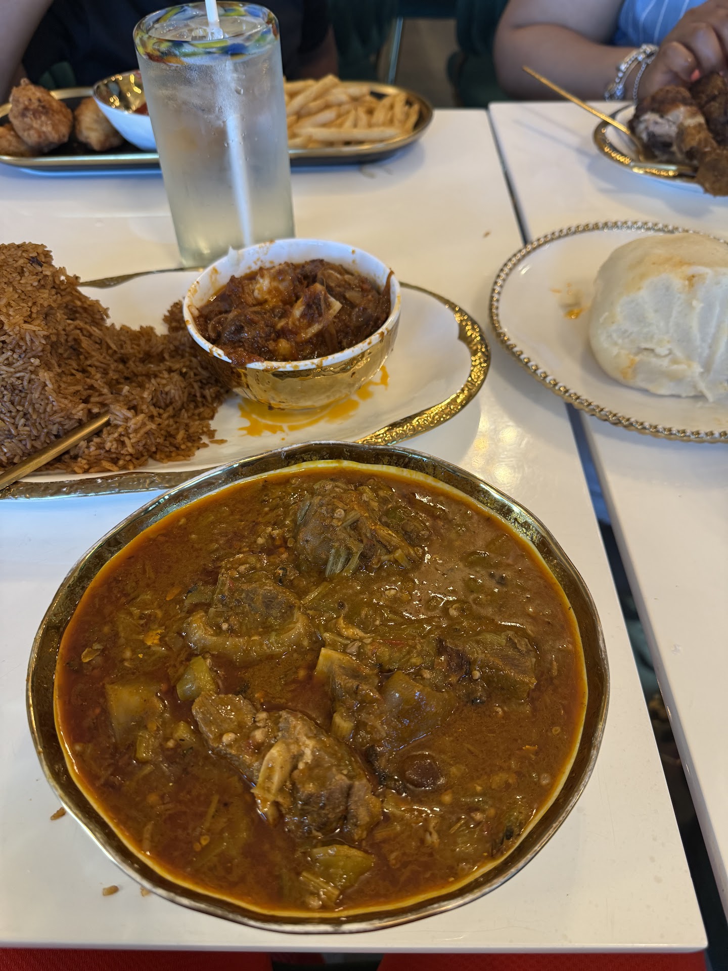 My first visit was April 30th, and I brought my two-year-old, who, let’s be honest, is still a chicken finger connoisseur. Luckily, they had some just for him — complete with fries, so no toddler mutiny occurred. But me? Oh, I dove headfirst into the most glorious bowl of okra stew with goat meat and banku. You know how people say food can change your life? That stew made me reconsider all my life choices. I also got jollof rice (goat again, because I have taste) and a side of fufu to go, because apparently I was prepping for a flavor emergency.