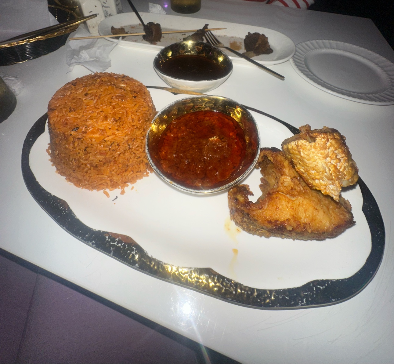 Ā Ā Ā Read moreAtmosphere is so calm and welcoming. The service was amazing and the food⦠Chefs kiss Iām American so i had so many questions regarding the menu, and they were so patient with me and explained everything for me. The food was SOOOOOOOOO GOOD!!!! Omgsh it was simply amazing i had the jollof rice with the stew fish and i just want to say it was thee best food Iāve had in a long time, very beautifully designed restaurant. The 2 women were incredibly helpful and sweet. I told 4 people about it and i only left todayšššš«¶š¾ love it there i absolutely will be returning. I didnāt get any pictures of my food because it was just that good lol. Just a reminder for those that may be allergic to shellfish they use shrimp seasoning in some of the foods so be sure to ask prior to ordering in case they forget...