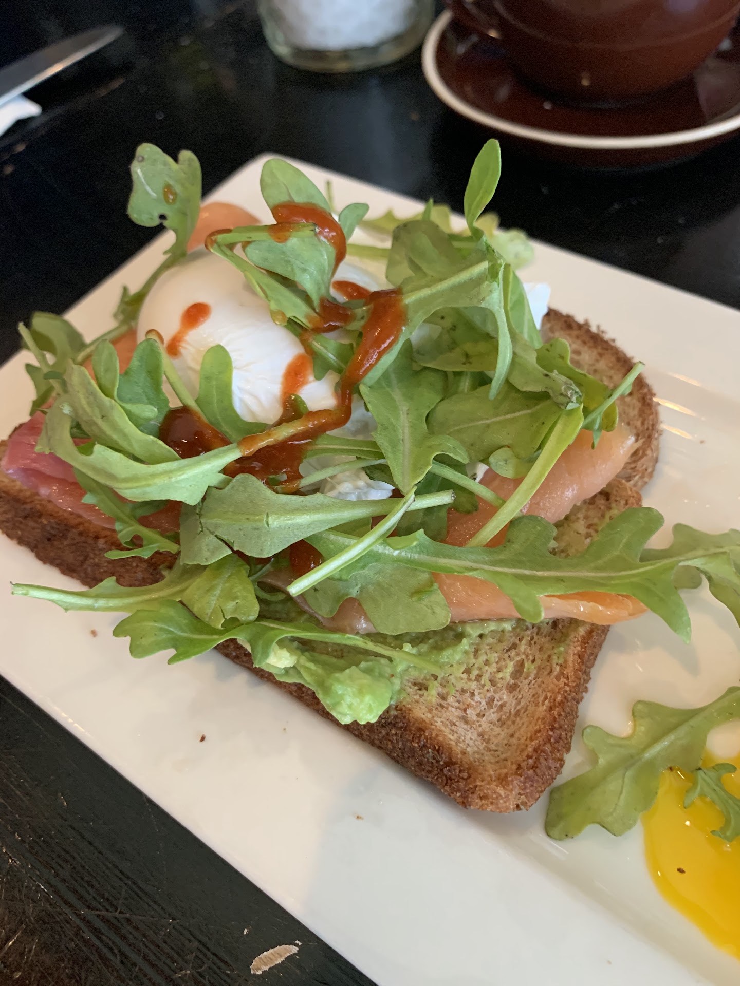 The avocado toast (pictured) was well below average—served on a soggy, store-bought slice of bread, topped with skimpy servings of salmon and avocado, and garnished with bruised arugula.