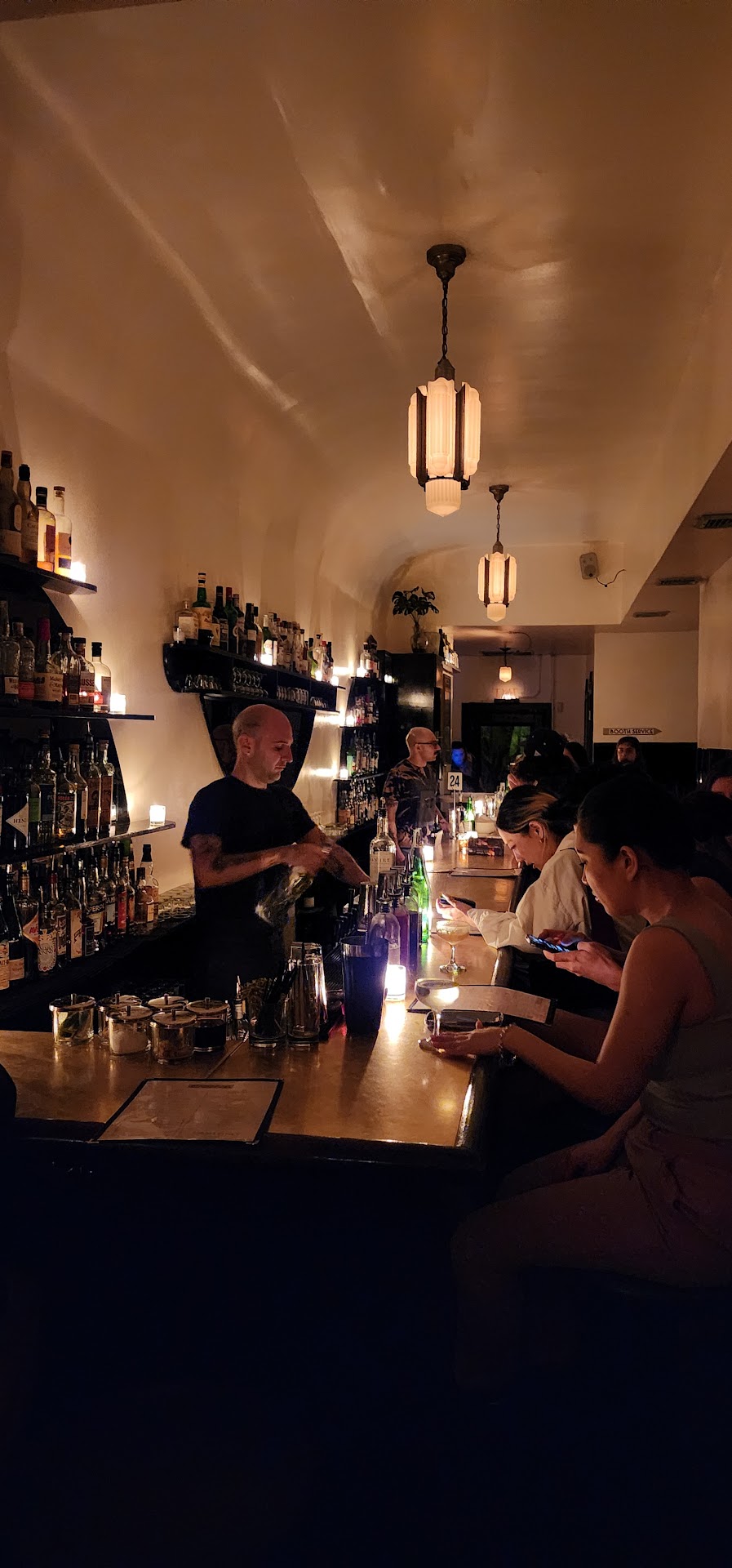 Booth service was a little slow (we were sitting for 30 minutes before getting out drinks and water...) but we chose this over sitting at the bar for our particular night so we were okay with the privacy. The place started to heat up around 10pm Thursday night--every booth and the bar was full, but we were still able to converse comfortably.