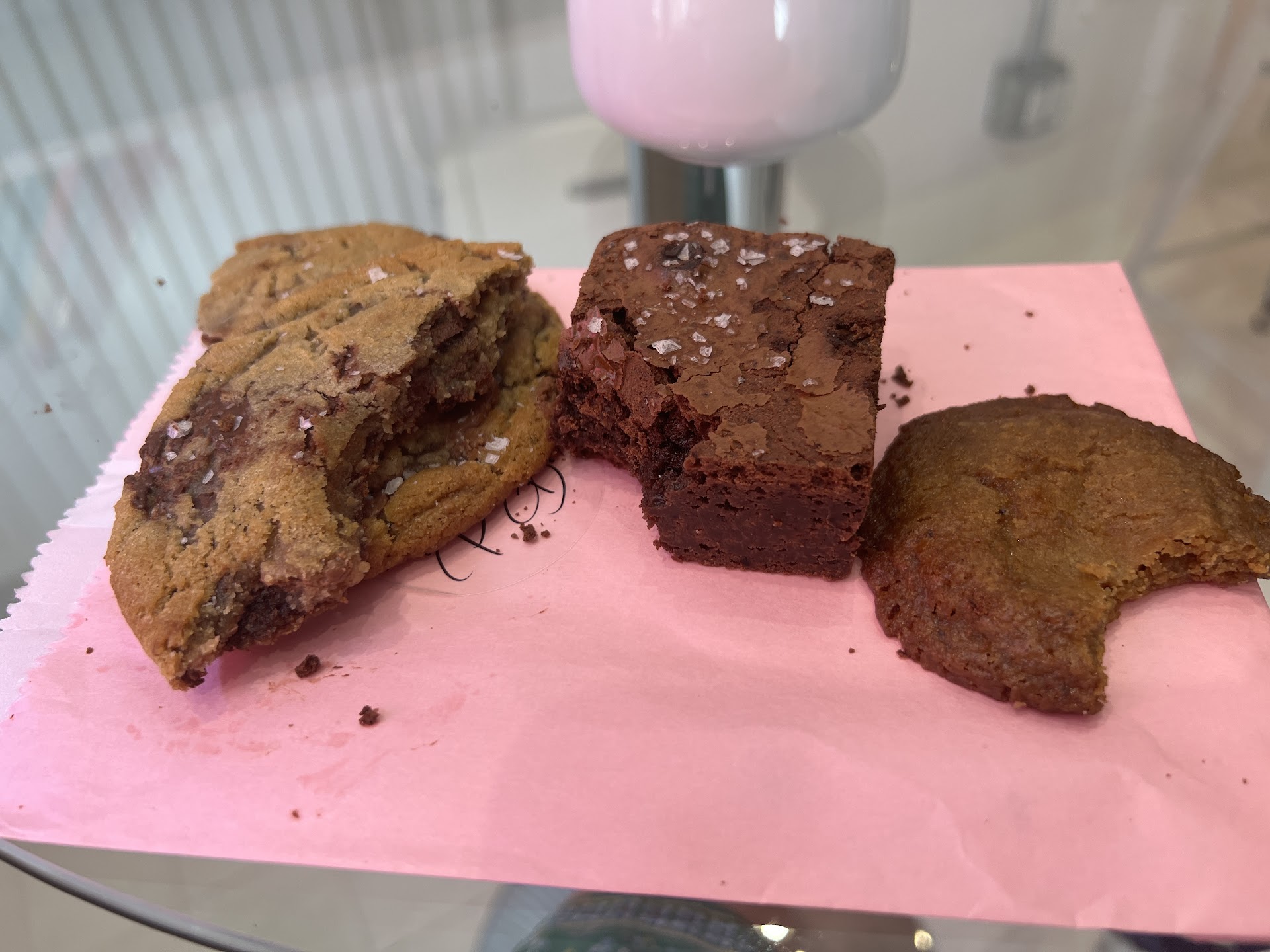 The 1/4 pound chocolate chip cookie is amazing. The sea salt, the gooeyness, the chocolatey-ness! So good. After talking with the staff I was worried the cookie would be too thin and crispy but it was perfect. It wasn’t thick like some other chocolate chip cookies but the texture was nice with a sink your teeth in feel even with the flatness. 10 out of 10. My friend got the smaller one and enjoyed it and also a ginger bread cookie that was the star of the show for her. The employee gave us lots of suggestions and talked to us about the different items. The place was small but cute and the smell as you walk in the door was delicious. If they could bottle that scent or make a candle, I’d buy them all. There were 4 small chairs and my friend and I sat at the window and ate our treats while chatting and looking out the window. It was cozy with some good tunes playing. We were comfortable even though the space doesn’t seem like too many people should be hanging around for too long. They have cute little decor pieces and some board games that we thought about playing but we didn’t want to mess up the book stacks. I’ll be back for sure! I want a whole box of those quarter pound cookies. Also the prices were great! I expected the treats to cost more but everything was...