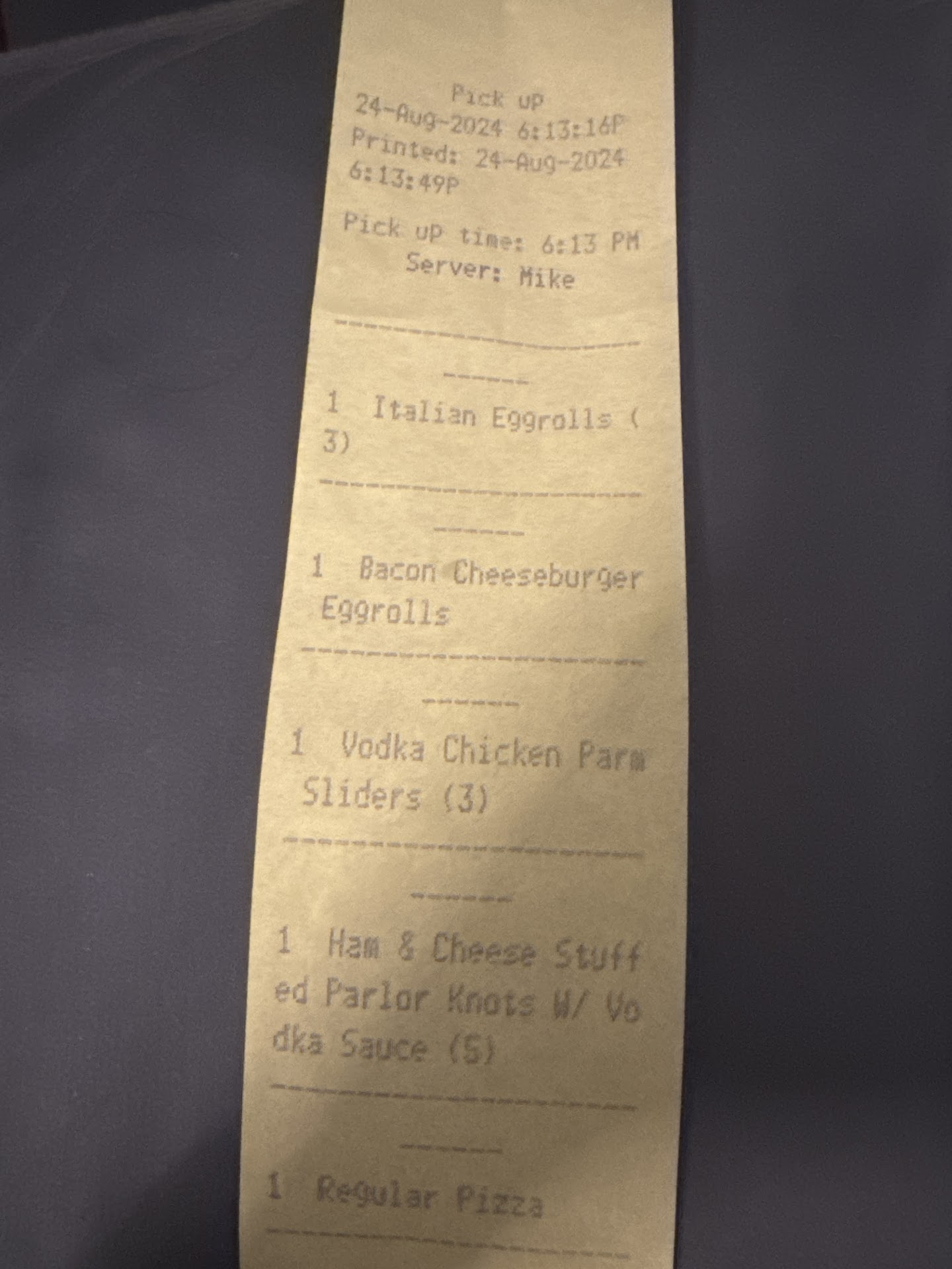 60 minutes after placing my order, I see a boxed pizza on the oven. I assumed it was mine, as I'm the last person in the place. It also appeared the second part of my order was prepared incorrectly, as their $5 garlic knots were bagged, instead of the $11 Parlor Knots I paid for.