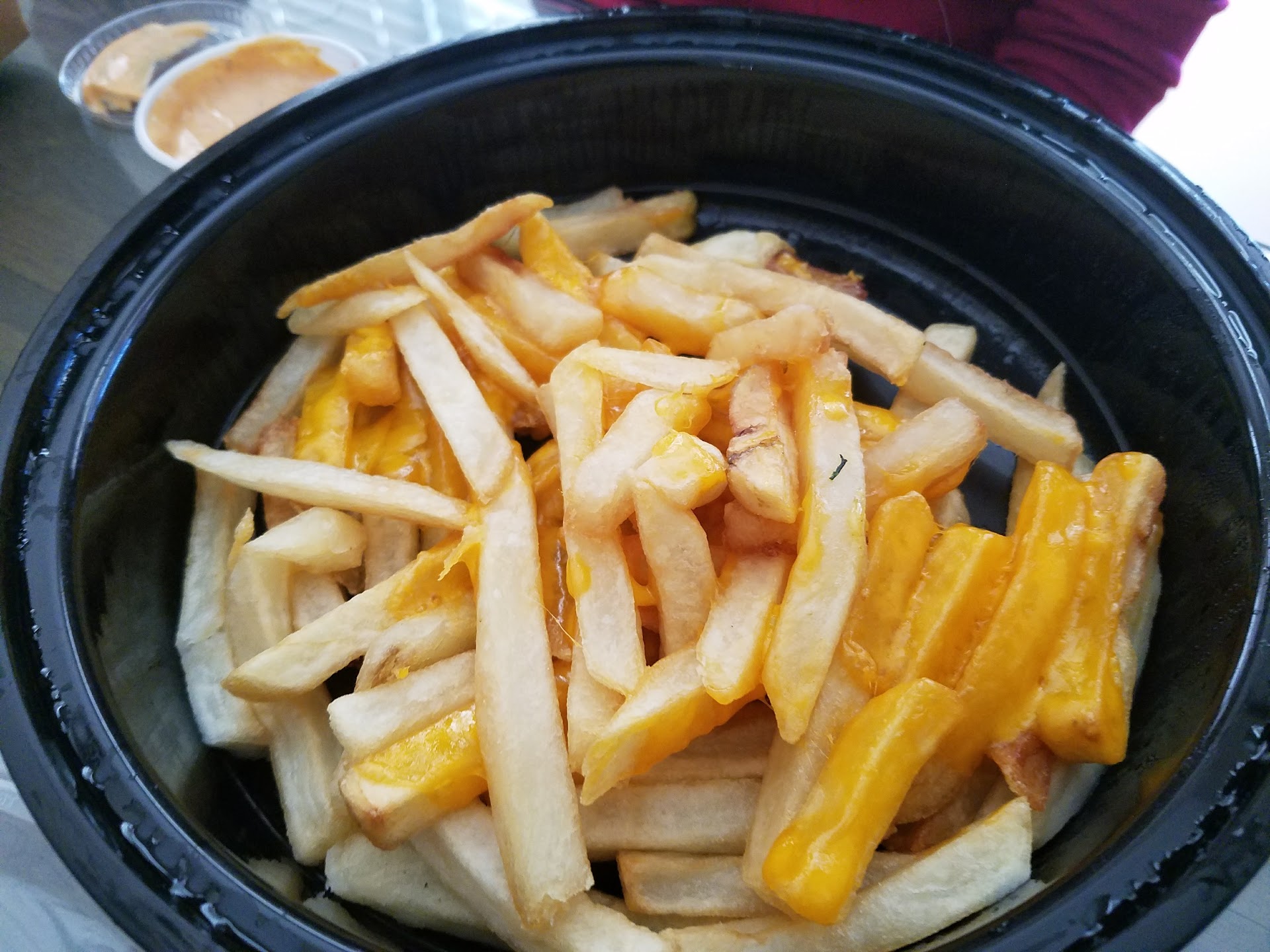 I wait outside and make a call that lasts roughly 28 minutes. I head back to the counter and ask whether the order on top of the oven was mine.