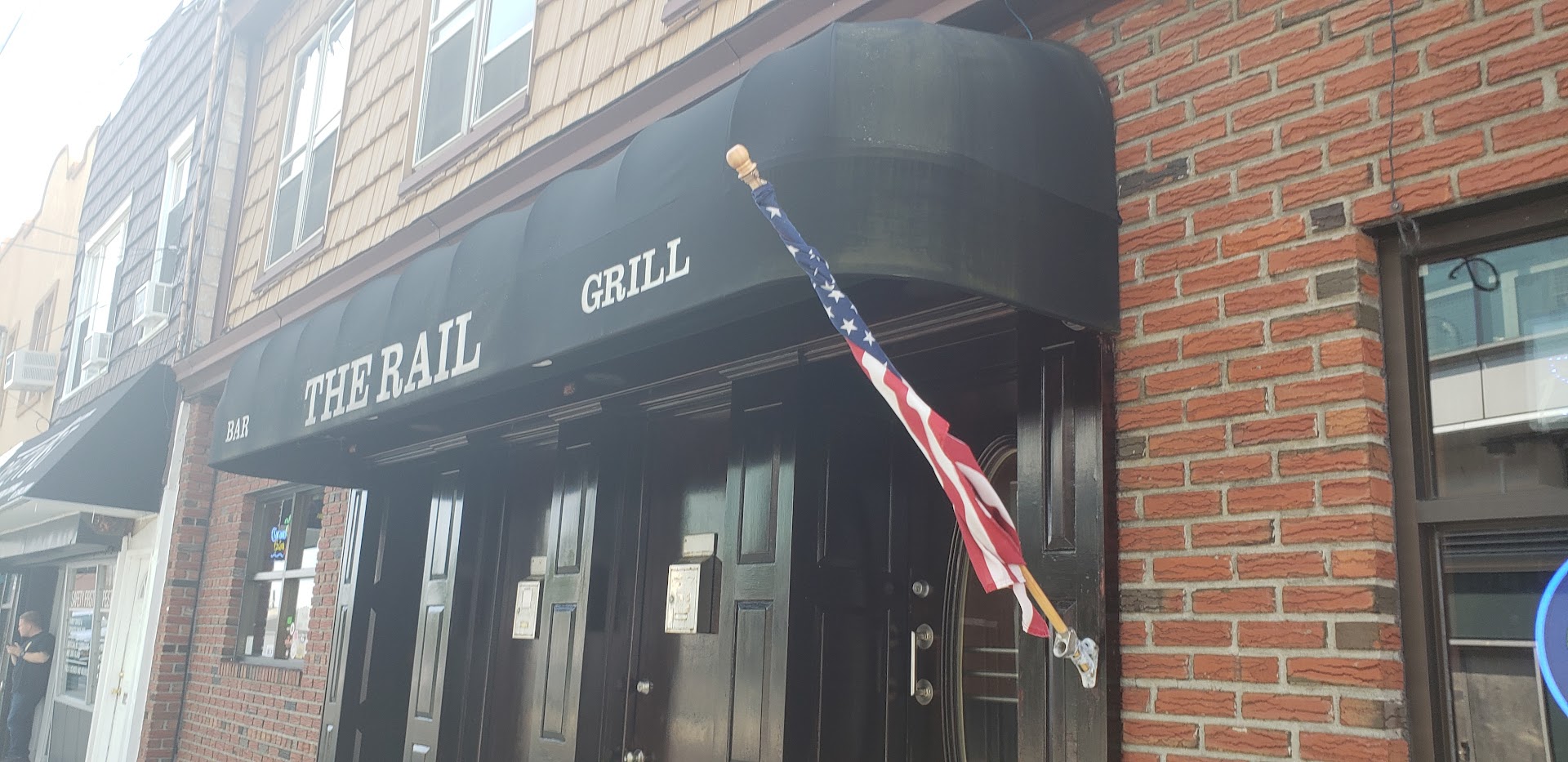 Note the BEAR in the photos who has a half NY Jet - half NY Giant helmet, aka as the BI-Polar Bear. The Rail is also the home of the Howard Beach Polar Bears. Food is intermittent and was WINGS only during football, but see photo for Opening Thursday Nite football. Also located nearby a Great Deli (Sal's around the corner), Chinese Take-out (at the corner), and "Neighborhood Pizza" (yes that's the name) provide food at other times.