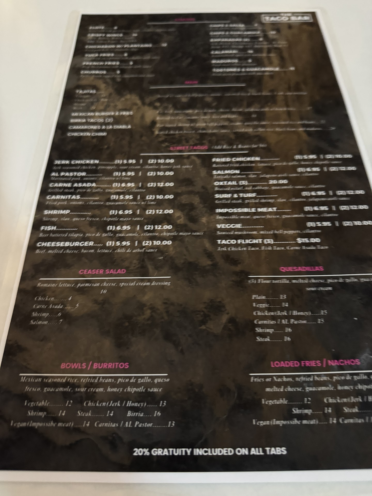From the moment I stepped inside, I was greeted with a lively atmosphere and the irresistible aroma of sizzling spices. The Taco Bar is known for serving the most delectable tacos, burrito bowls, and margaritas, and let me tell you, they did not disappoint! 🤤