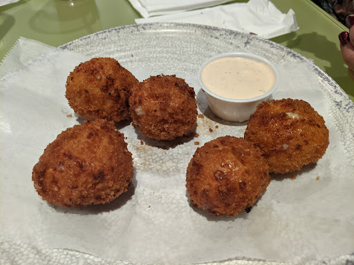 Appetizers came out, Mac and Cheese bites were great. Chicken wings were a generous portion and quite "over" fried. One drum was fried to a crisp (super dry)...see photo. We were starving so it was devoured before we could even get plates! (Which the server brought over after the fact).