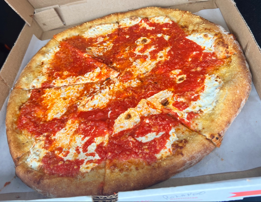 First off, the pizza is thin sliced, the cheese isn't evenly placed, but on the center and sprinkled. The cheese is not typical pizza cheese, it's a bit like ricotta, I'm not sure what it was, but it was good. The sauce isn't overflowing like some pizzas, which is a good thing, and it didn't take away from the taste of the cheese.