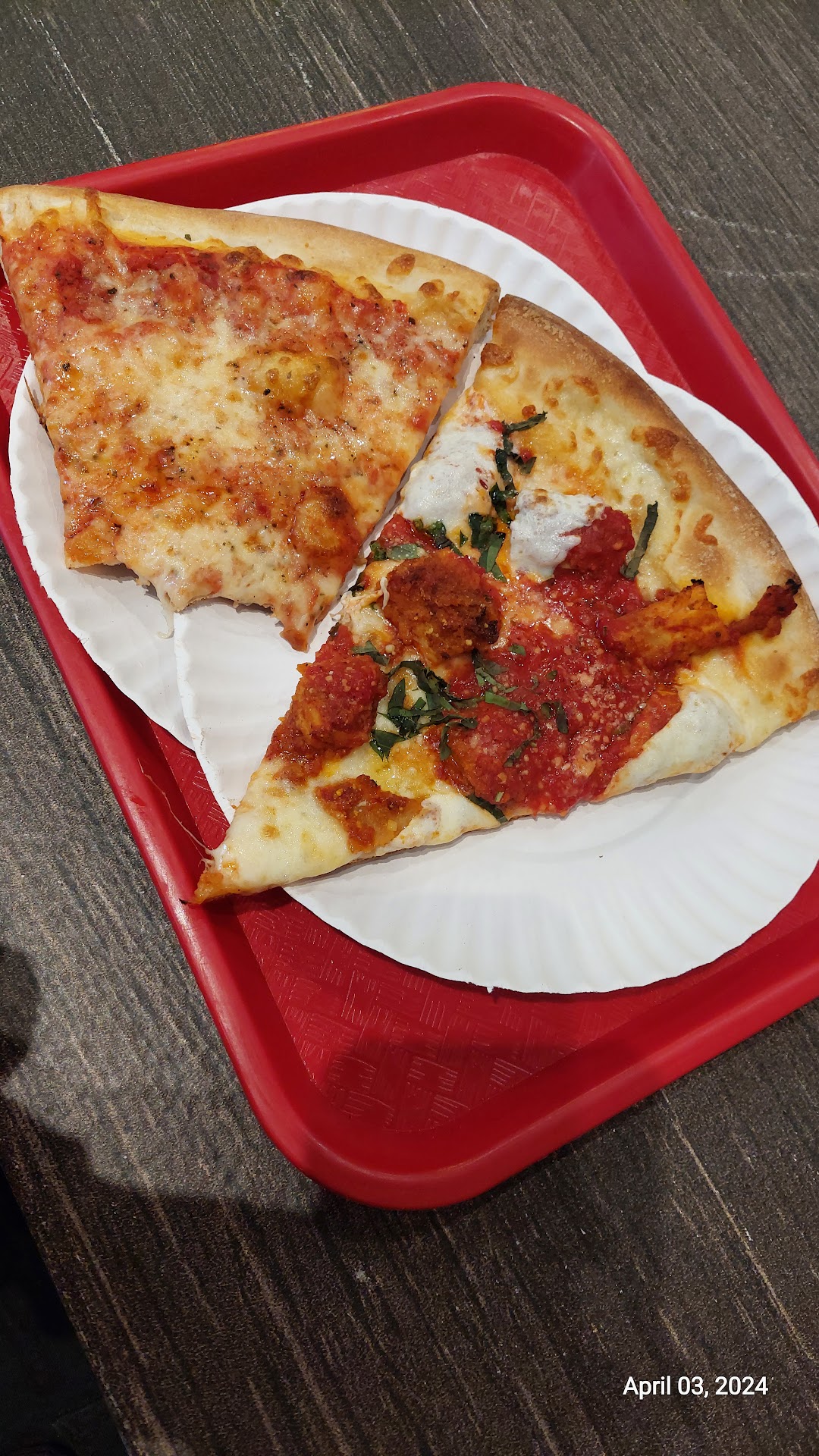 All three slices were warmed to perfection. The white slice was garlicky and cheesy flavorful, and the extra little burnt end was a nice little treat to start the slice. But it would have been better if the dough had not been as dry as it was.
