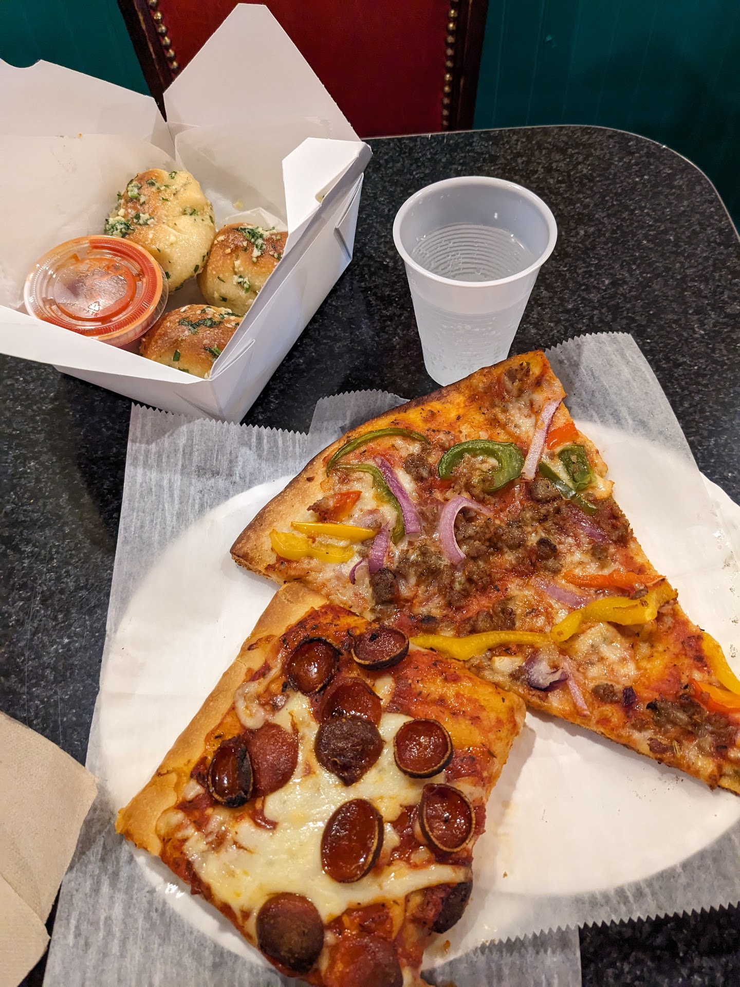 The worst part was the service. I had to catch a show and asked them to give me a box for 2 slices. The guy refused by saying they didn't have any boxes. I could literally see around 50 boxes. I let it go, but then I timed my travel and realized I would have to rush eating if I don't get a box. So I asked again to switch my slices from being stuffed in a brown bag to a box. Now he said the boxes were for delivery. I told him about my show and that I can't eat on the go without a box. The guy said he'll give me a box if I get another slice - to make it a total of 3 slices. Pretty ridiculous...