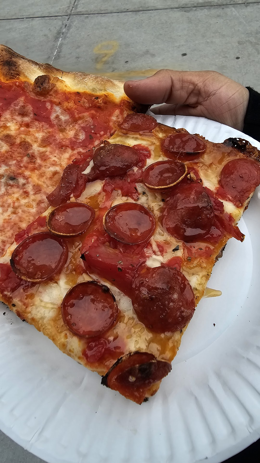 Ā Ā Ā Read moreConveniently located just outside of the Brooklyn bound R train station, this pizza spot is great for a slice or a pie and itās open late (till 2-3am). Had the pleasure of meeting the owner Aiden (sp?), heās a super chill guy. They do a Detroit-style pepperoni slice, pictured, they get the cheese all the way to the ends so itās nice and crispy. I really enjoy the ācupperoniā style pepperoni. While that slice was great, I really enjoyed the spicy supreme slice, also pictured, which was sausage, pepperoni, onion, and jalapeƱo. The honey added the perfect amount of sweet to that spicy slice. Iām also a fan of their logo. Great no...