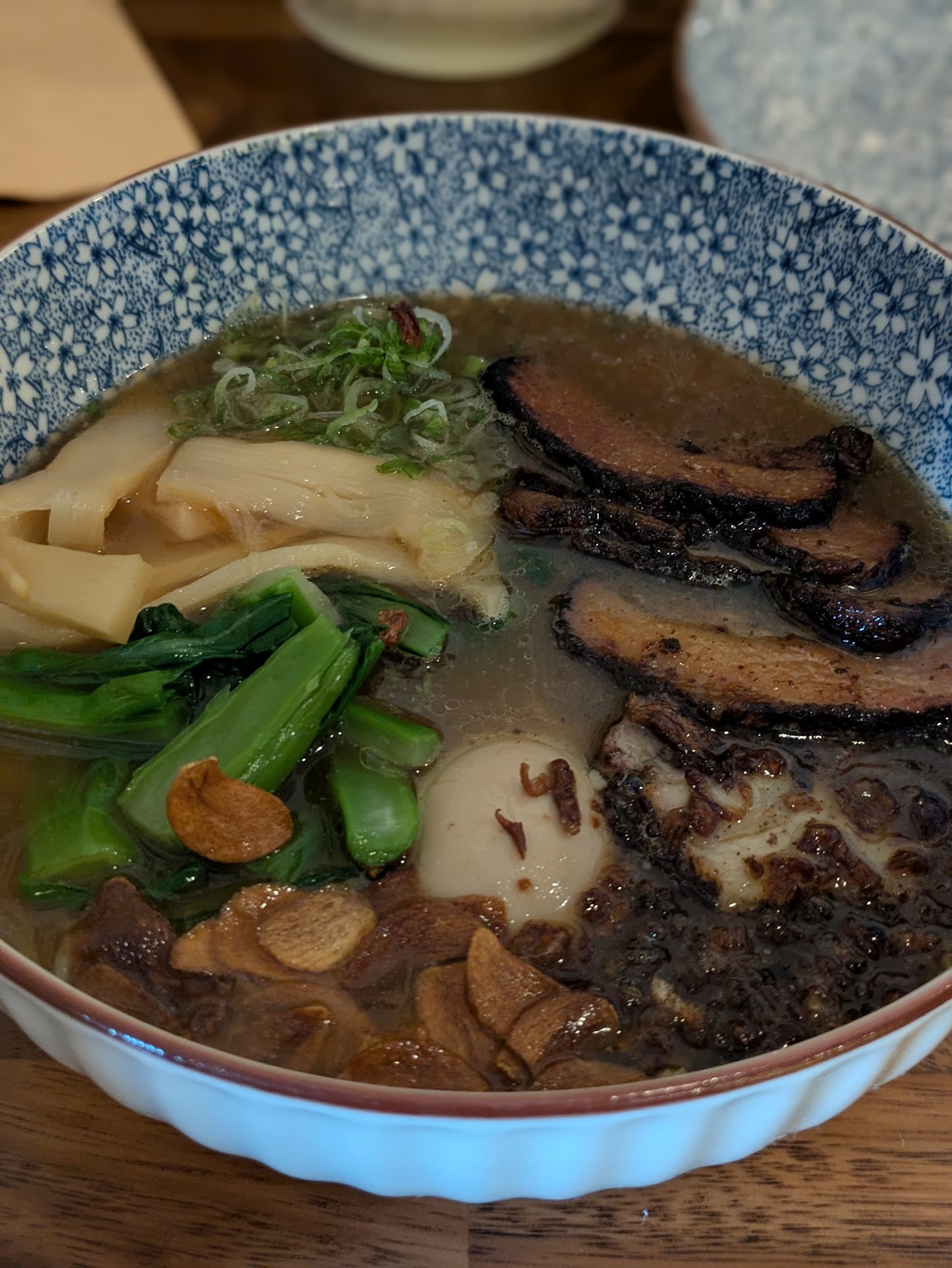 Food was disappointing. We got the tonkotsu ramen, chicken ramen, and ube sweet potato with blueberries and ginger creme brulee. For both ramen the broth was actually not bad at all. Same for the noodles; they had a good bounce/chew to them. However, the roast pork in the tonkotsu ramen was a huge miss. They gave 5 slices, which is actually a lot and wouldve been a great plus, but 4 of the 5 slices were way overcooked. Not tender whatsoever. Maybe it's just me but normally when I get the roast pork in a tonkotsu ramen I'm looking for soft, tender, almost melt in your mouth pork belly type of roast pork. This was nothing like that. It was almost like 4 slices of pork jerky and 1 slice of almost soft roast pork. Huge miss in my opinion. Second, the braised chicken leg in the chicken ramen also tasted burnt. Seems like a theme in the main toppings of both these dishes. Lastly, the "creme brulee" is no creme brulee at all. It's more like a bowl of mashed ube sweet potato with blueberries in it topped with a thin hard caramelized shell. They got the top layer right, but the rest of it was not it. It was not smooth or creamy at all. It had mashed potatoes consistency. There were also candied ginger scattered all around it which didn't seem to go with the flavor profile at all. So overall this was a miss for me which is a shame because I really wanted to enjoy and...