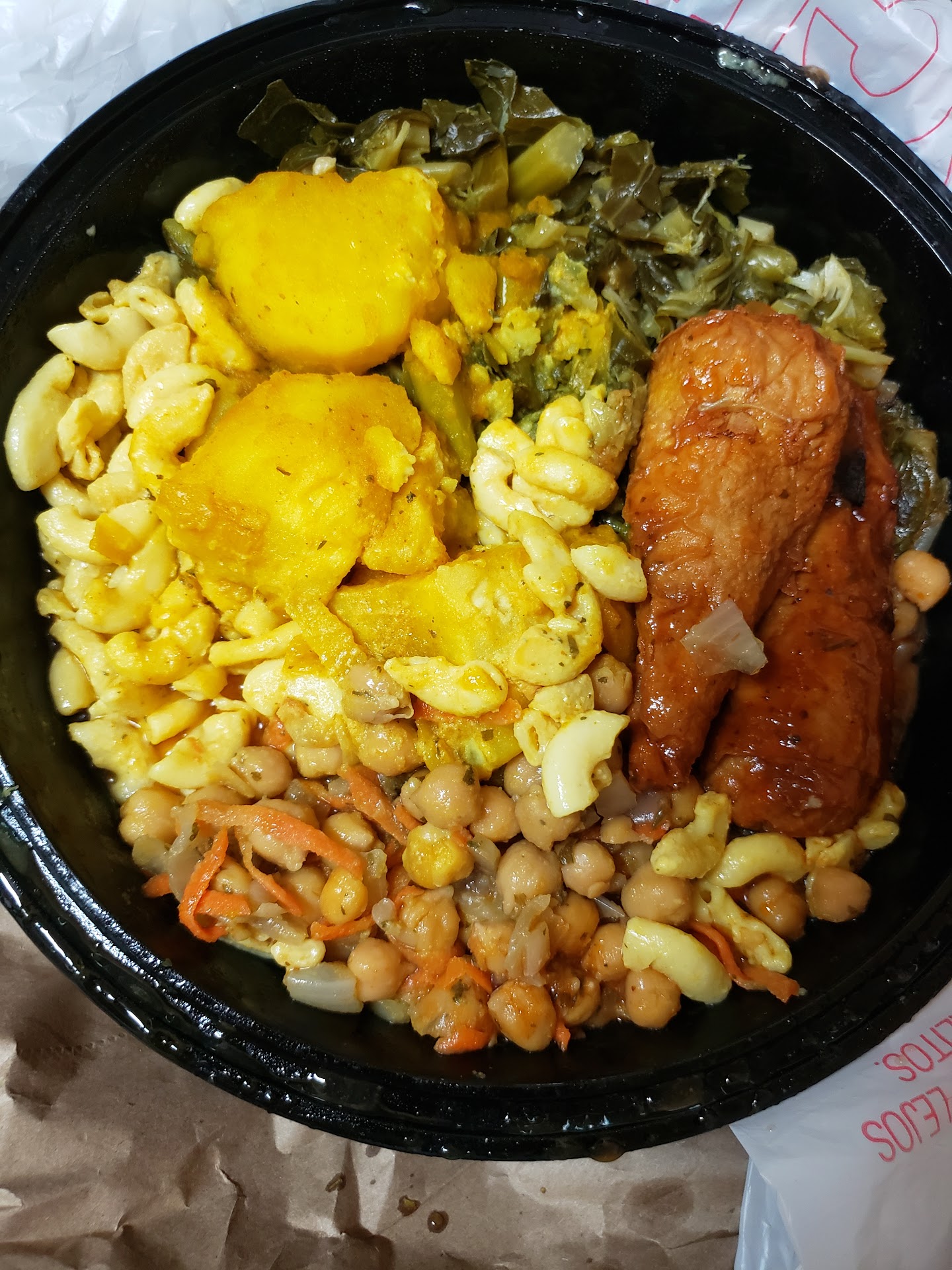 I don't know if there was a different cook today; I did see different people, in any case, food should be consistent in flavor when you run a restaurant in NYC. The first clue that should have passed was the curried chickpeas didn't look cooked all the way and they were swimming in something, I don't know what. I was told it was curry. After tasting my meal, I would say it's debatable. I opted for the "seasoned" chickpeas. They were too firm to enjoy. The fork shouldn't have any resistance when skewering a chickpea. I had to apply firm pressure to get it to pierce. The curried potatoes had a hint of curry and the salt was missing. It just tasted like soft bland potatoes colored with curry. The collard green's tasted as though they forgot the vinegar and could use a bit more salt; barely any flavor. The worst was the mac and cheese. There wasn't even an attempt to make it taste like cheese. It was more a macaroni salad. Totally different flavors. I got the barbecue "chicken" this time, but didn't bother trying it. I am too pissed after spending $35 on this meal alone. To add injury, I purchased the pineapple tart, additionally,only find mold on the bottom and of course I am too far away that I can't turn around and bring it to their attention in person 😤 Nearly $40!