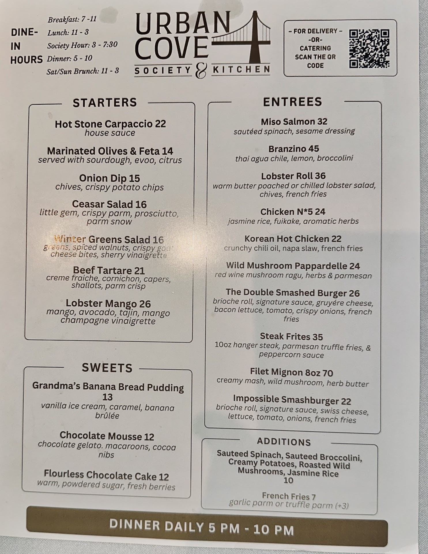 Read moreThis place sounds so promising but everything was a fail starting from the print menu. The print almost went off the page. Bad sign #1. Not sure where they got the photos posted on their review or site but what we ordered was nothing like it. The Fluke appetizer was so fishy and not fresh and the garnish was even stale looking. It was soaked in sweet sour syrup. It was so embarrassing. Then we ordered the Tin bread w fig and ricotta cheese. This should of came first but it didn't come until after the entree after reminding the waiter a few times. Bread was burn toast w butter. No ricotta and no figs. We ordered 1 burger and 1 chicken sandwich. I guess the burger was good but the fried chicken was bland and worth than what you can get at any fast food. Plus it wasn't made like how it was described on their menu.