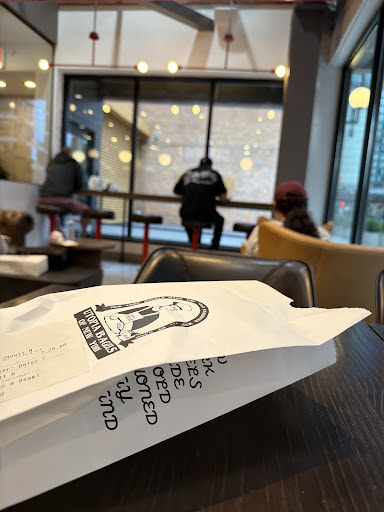 For the food, I ordered the Garlic Bagel with over easy egg, cheddar cheese, sausage, lettuce, tomato, and Mike’s Hot Honey. This was a disappointment because the eggs were not seasoned at all, and the garlic bagel was burnt (see photo), which left a bad aftertaste. Because nothing was seasoned, the hot honey just made the whole sandwich sweet. I also ordered the blueberry bagel with blueberry cream cheese, which was much better. It was not overly sweet (though I thought it could be a touch sweeter), and it was clear they mixed regular cream cheese with blueberry jam or marmalade. I would order that again.