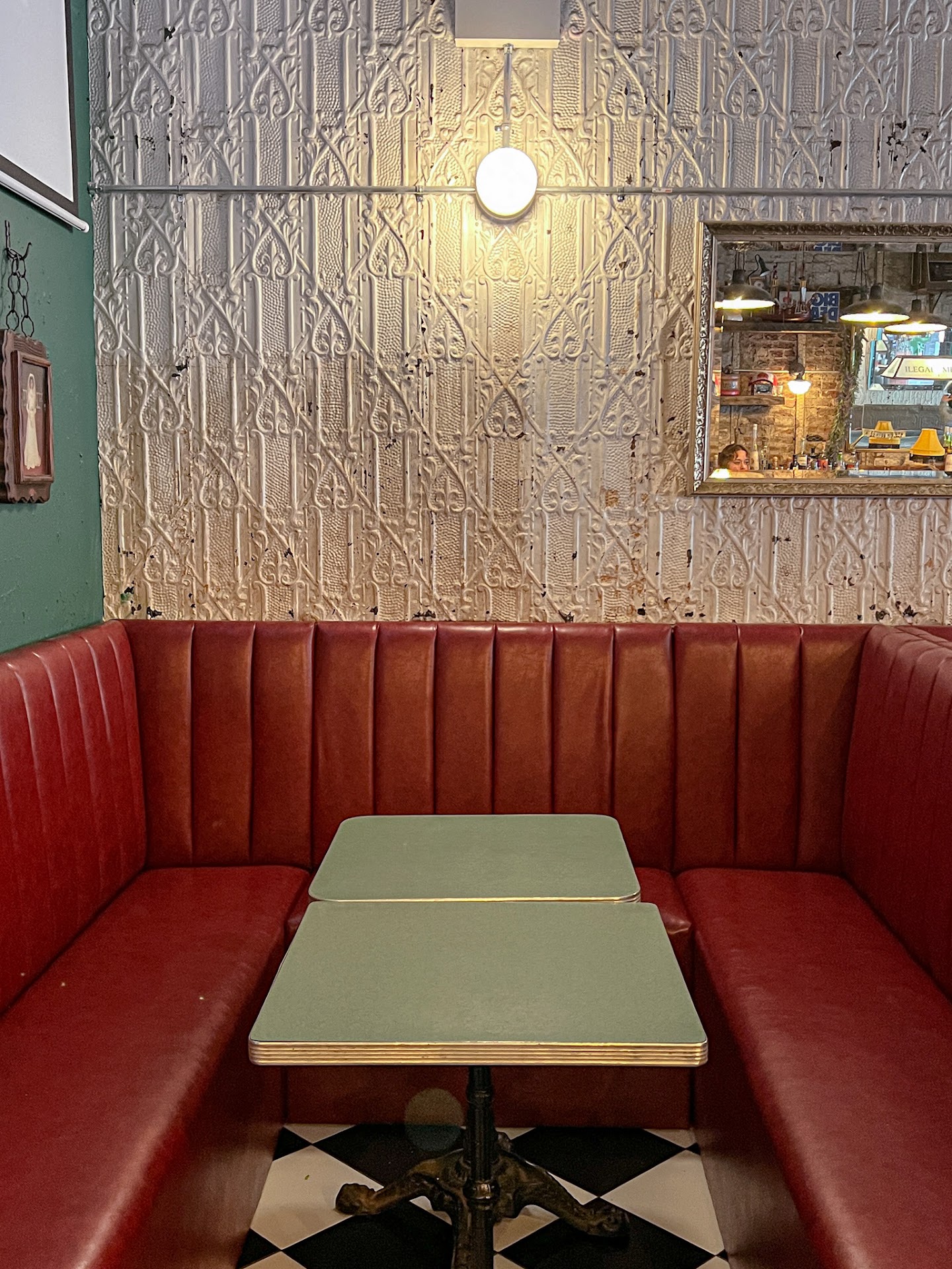 Beautiful space. A lot of thought and intentionality was put into the flow of the space, with different types of seating and an âmâ shaped bar which is a welcome alternative that allows the flow of people to be uninterrupted when people gather, and gives good visual space markers between the bar area and table area. Decor is cute, and with old italian style red checkered table clothes with paper on tol, lots of deep greens and great use of texture in the space. Behind the bar is reminiscent of scorpion records but organized, with old license plates, trucker hats and electicisms.
