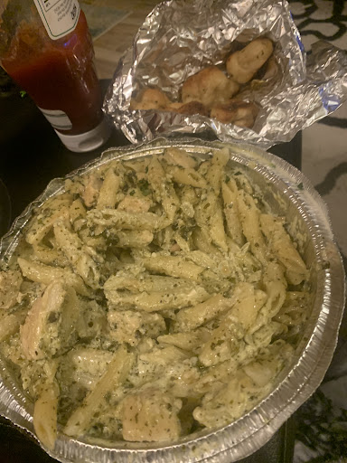 When our food arrived it was nice and hot! It was my first time ordering a pasta dish from here and it was amazing! I loved finding whole garlic cloves in it 😋...