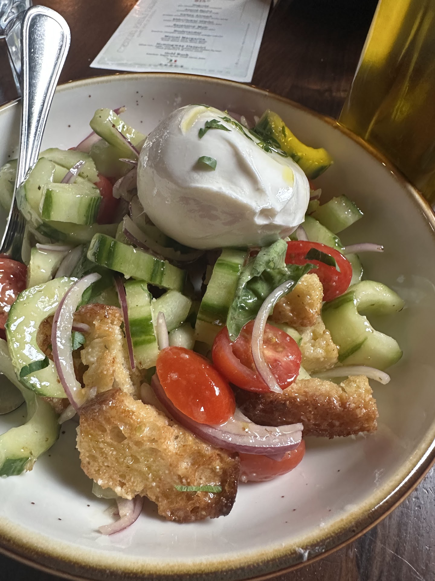 Let’s start with the salad: Burrata e panzanella. The burrata was really good, but the salad itself was too sour. The mix of cucumber, red onions, tomatoes, and the dressing was okay, but the burrata didn’t work for me on that particular combination. I give it 3 stars.