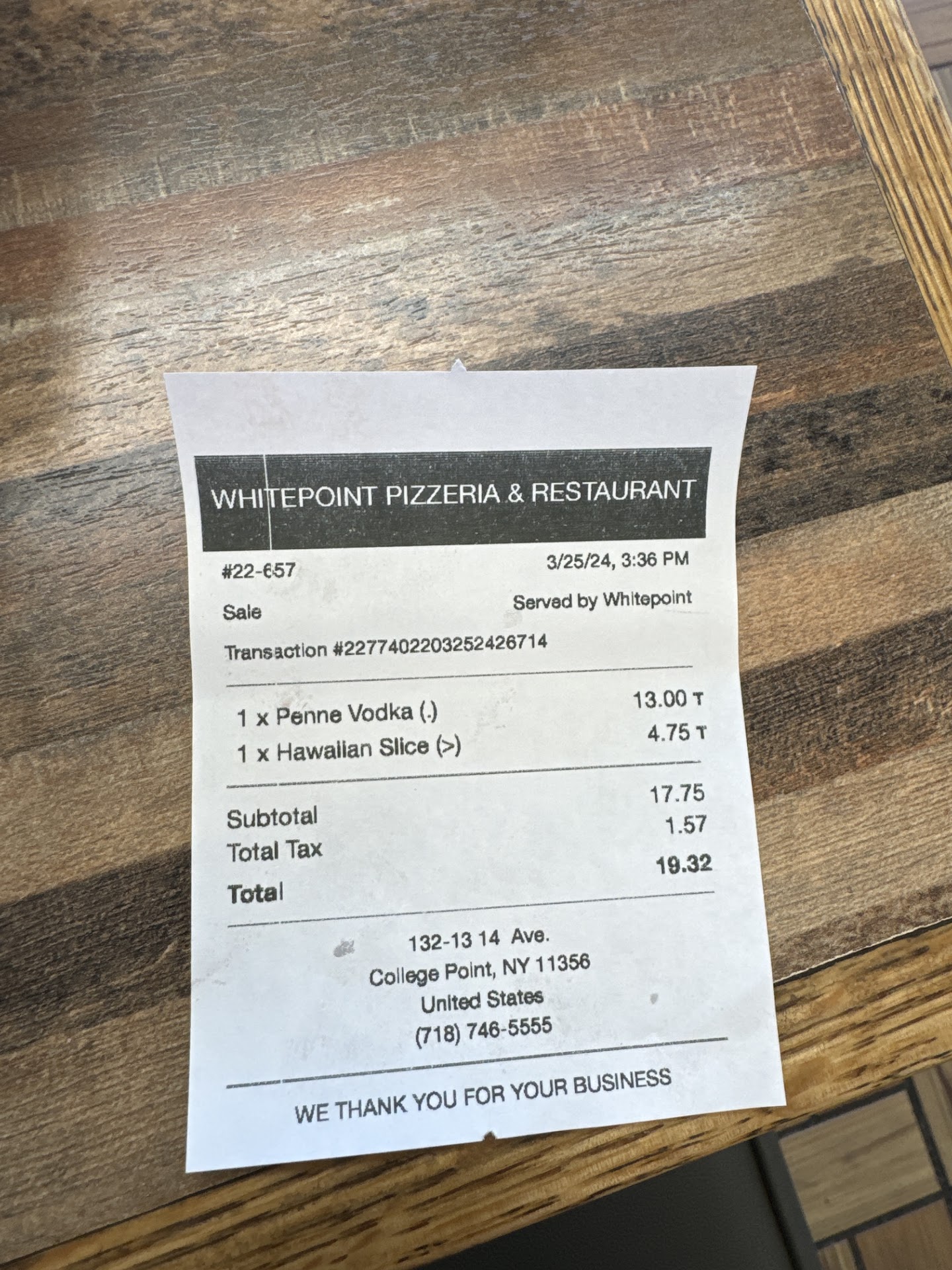 Read moreAfter a nearly 10 minutes (there is a clock behind the counter) of being ignored at the counter...and I mean the 5 or 6 people working wouldn't even make eye contact with me and I was leaning on the counter with a $20 in my hand. I asked if anyone was taking care of the counter, one person stepped up. I usually get two pieces and I ask them not to heat it up, how long does it take to put 2 pieces in a box? Then another person doesn't tell me what by bill is, goes to grab the money out of my hand, I commented to him, now you're going to rush ME? The owner (I think) was walking behind the counter and asks whats going on, so I tell him. Instead of an apology, he whines to me about how busy they are. Too busy to take care of the counter? There was only one table of three seated and no one waiting. The whole time I watched one person after another picking up their phone orders, but they couldn't take a minute to take my order? Now I know why...why no the place wasn't crowded on a Friday and why the phone was ringing off the hook.....the service is terrible. On another note, their delivery guy, regularly parks his beige Lincoln illegally...