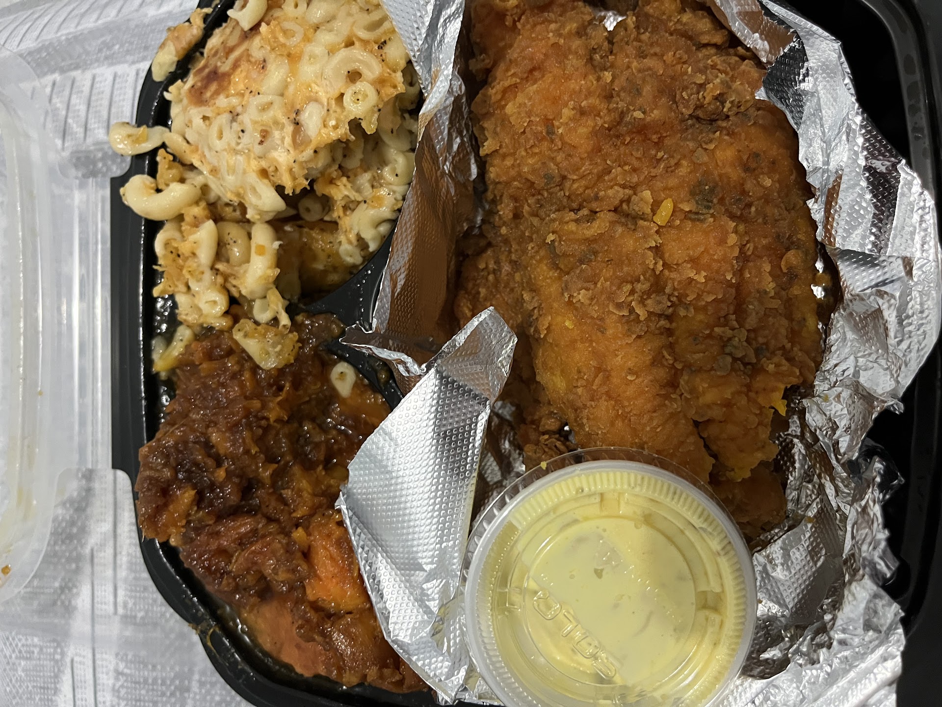 Okay. So originally I wanted to be nice with my review because I love black business and I try to support but REAL HARD criticism is not a bad thing always so I have to be real. Im from the SOUTH! So I know good soul food! Since I been up here in NYC I havent had nothing nowhere NEAR the same as it is down south. When I ordered the FRIED catfish, it should be fried HARD AND CRUNCHY! Because its FRIED! Not BREADED SOGGY FISH! It should have great flavor, it doesnt have to be over seasoned though! With maybe a good beer batter! And a good sauce! I see him trying to flavor it good but i cant even put my finger on what seasoning he used, maybe he just used too much or something i dont know but it wasnt cohesive. Not something id want my seafood let alone anything be flavored like. Next, the collard greens. Pleaseeeeee start putting that youre putting pork in your greens for us people that dont eat pork sir. I been sick as hell after i found out it was pork in them after i ate alot of it already! The baked chicken and gravy, again what seasoning is this? And where is the gravy? And what flavor is this gravy? U dont have to overseason every little thing hun! The rice was so nasty I couldnt eat it. Money wasted. I spent 70$ and i could barely eat any of it. So im definitely not happy. The mac and cheese! Baby where is the cheese taste? Where is the cheese period?! All i tasted was some seasoned pasta! Wheres the 5 cheeses baby? The oreo cheesecake was good tho smh. Go to someone grandma kitchen in the south and learn some real southern food baby...