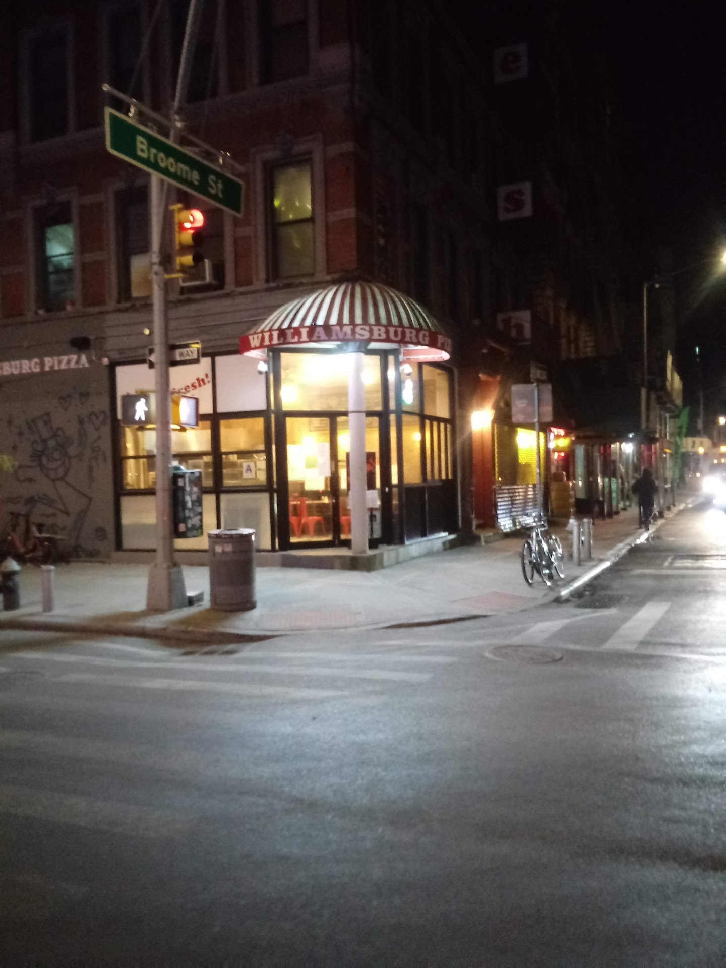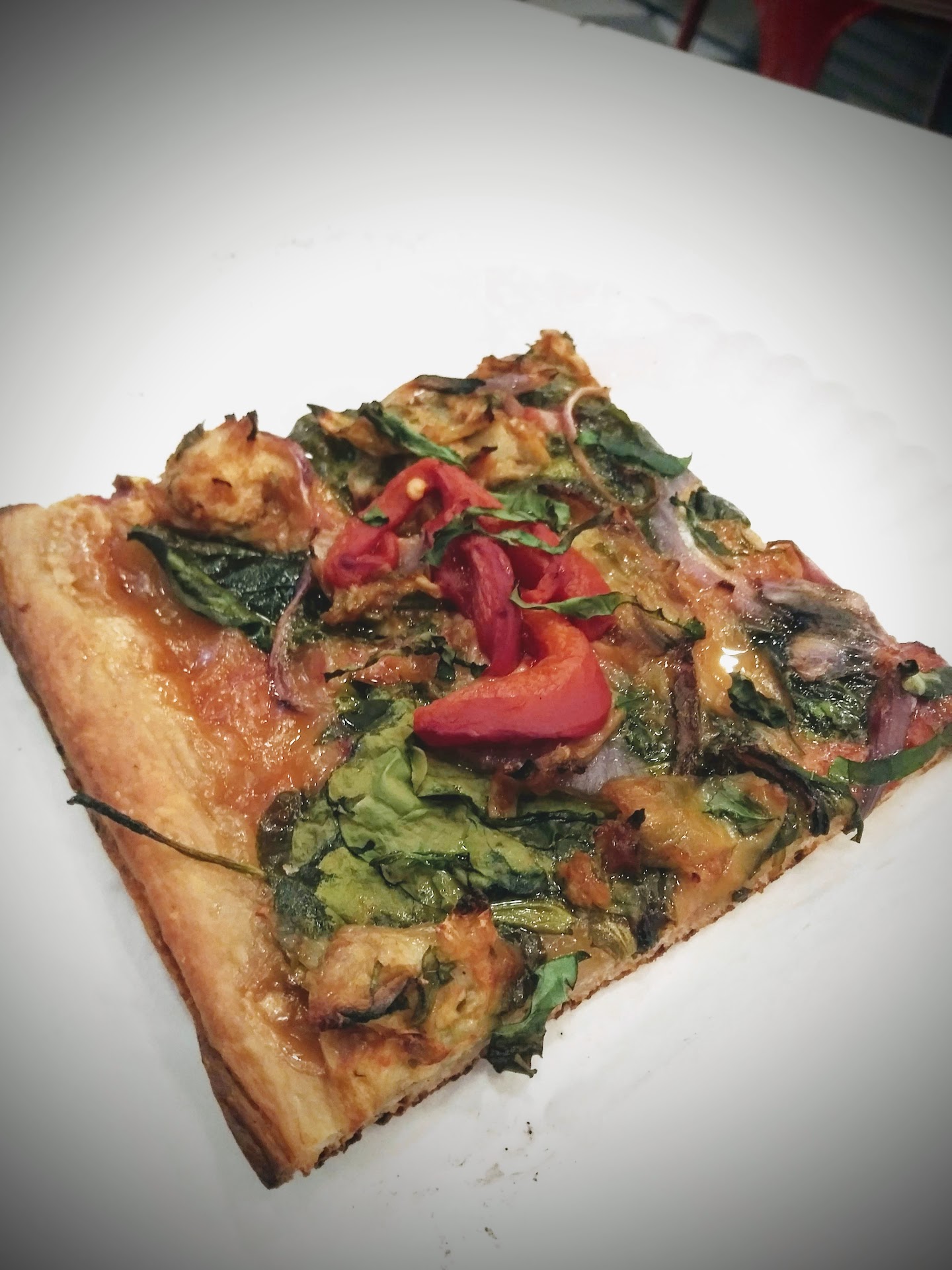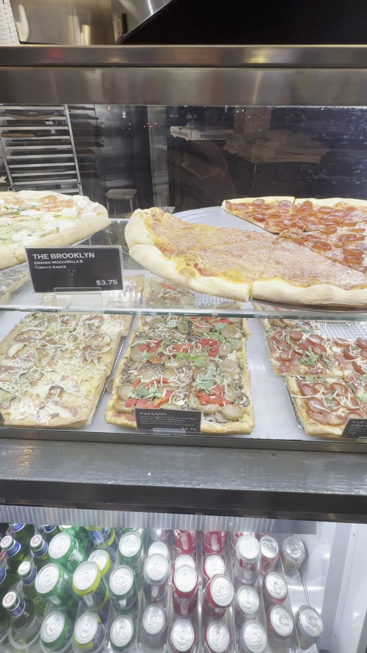 I rate for food unless the other criteria are a serious problem. That being said, this place has the best pizza in the area. The 14 pizza varieties INCLUDING VEGAN/ VEGGIE SLICES are great ranging from their regular cheese slices which are large and have a crispy and chewy crust with a nice bite. The regular pepperoni slices are just as good with a pretty spicy version of pepperoni. They have so many types I can’t remember them all. The square slices are smaller in comparison, but they’re also delicious. The prices are almost right but a tad high like $3.50 to $4.50 per slice. They do whole pies. Plenty of drinks. I don’t think there’s a soda fountain. Day staff isn’t particularly friendly but not unfriendly. Night staff is more friendly. There’s about 7 tables inside and 3 outside. There is a counter to eat at also but if you stand there it’s crowded and blocks the trash cans. Ovens are hot and slices come out quickly. They have one set of condiment shakers that they ask not be taken to tables. One napkin dispenser at the counter. Not too loud music plays. Medium bright lights. Tables aren’t usually wiped down frequently but it’s usually just a bit of oregano and crumbs. No bathrooms. Lively corner spot with moderate foot traffic, but delivery bikes cut across everywhere in the outside pedestrian plaza. There’s a cool dive bar, The Emma Peel Room, diagonally across the plaza that does t mind if you...