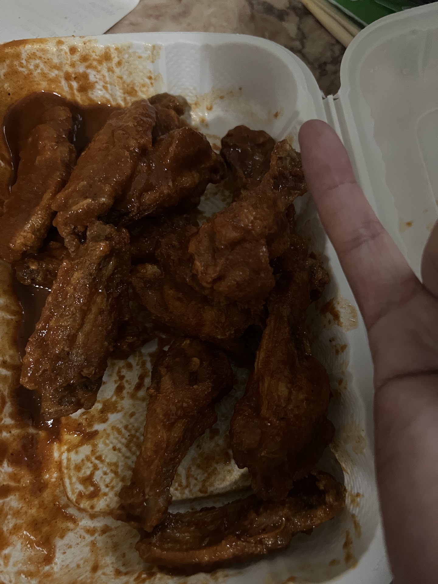 Original: The wings here are a joke.. SAVE UR MONEY…the quality drastically went down compared to the other reviews with wings in the pic. i got 20 wings too because of all the good reviews. I love wings and i saw people say this wing spot is their fav, jumbo wings, blah blah blah. There are 2 wings out of 20 that is bigger then my pinky… and ofcourse these little things are overcooked And their packaging SUCKS it spilled...