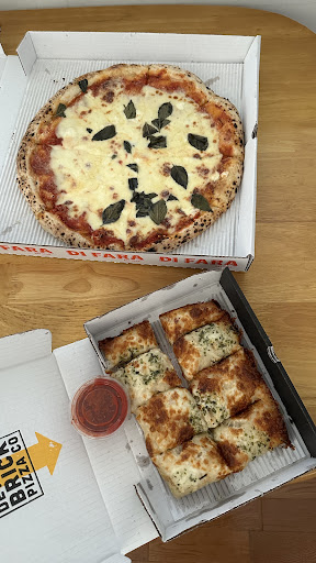 App said ready for pick up within 6 minutes of ordering so I went in, then was told it needs more time..? Waited additional 5-7 min in store. I knew something was going to be off when it smelled a little weird facing the kitchen. Twice the fire alarm rung very loud as I was waiting for whatever reason??? I seen a women walk out because of that. The Garlic bread was fine. The di fara pizza didn’t look like the ones I seen online. I had both Di fara frozen and from midwood couple times, amazing. THE FROZEN DI FARA IS BETTER than this. DISGUSTING. Had a weak smell, rubbery chewy ah dough, cheese that slides right off in one big glob that was overloaded in what tasted like cheese from mozzarella sticks which I hate because I tend to choke on mozzarella sticks and don’t eat them. Sauce was okay but at the same dry, and was BARELY any compared to the cheese. They only use the same basil from di fara. If u got the 50% of 2 orders from the mail use them to order from third party restaurants listed on their app. Don’t order directly from these scam artists. Bravo pizza across the street or frozen di fara found in supermarkets would save you all this bs...