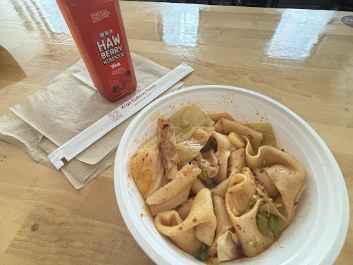Food: Okay, I'm going to be as truthful as possible here. If you are not a spicy food person, this place is not for you. I ordered the Pork "Zha Jiang" Hand-Ripped Noodles at the kiosk and customized it to have the least heat. I felt the heat. Not a painful heat but a good one. As a person that can handle some level of spicy, I did not mind it at all. The noodles were delicious and it even help me clear my nose 🤣. Yes, some other people and I were using a decent amount of napkins to clean our noses. I had to go buy something sweet after I was done with my noodles. I would suggest, if you want to customize the level of spiciness in your noodles, order at the cashier. Hopefully they can have a clear understanding of how much heat you really want in your noodles. I'm going to do that next time.