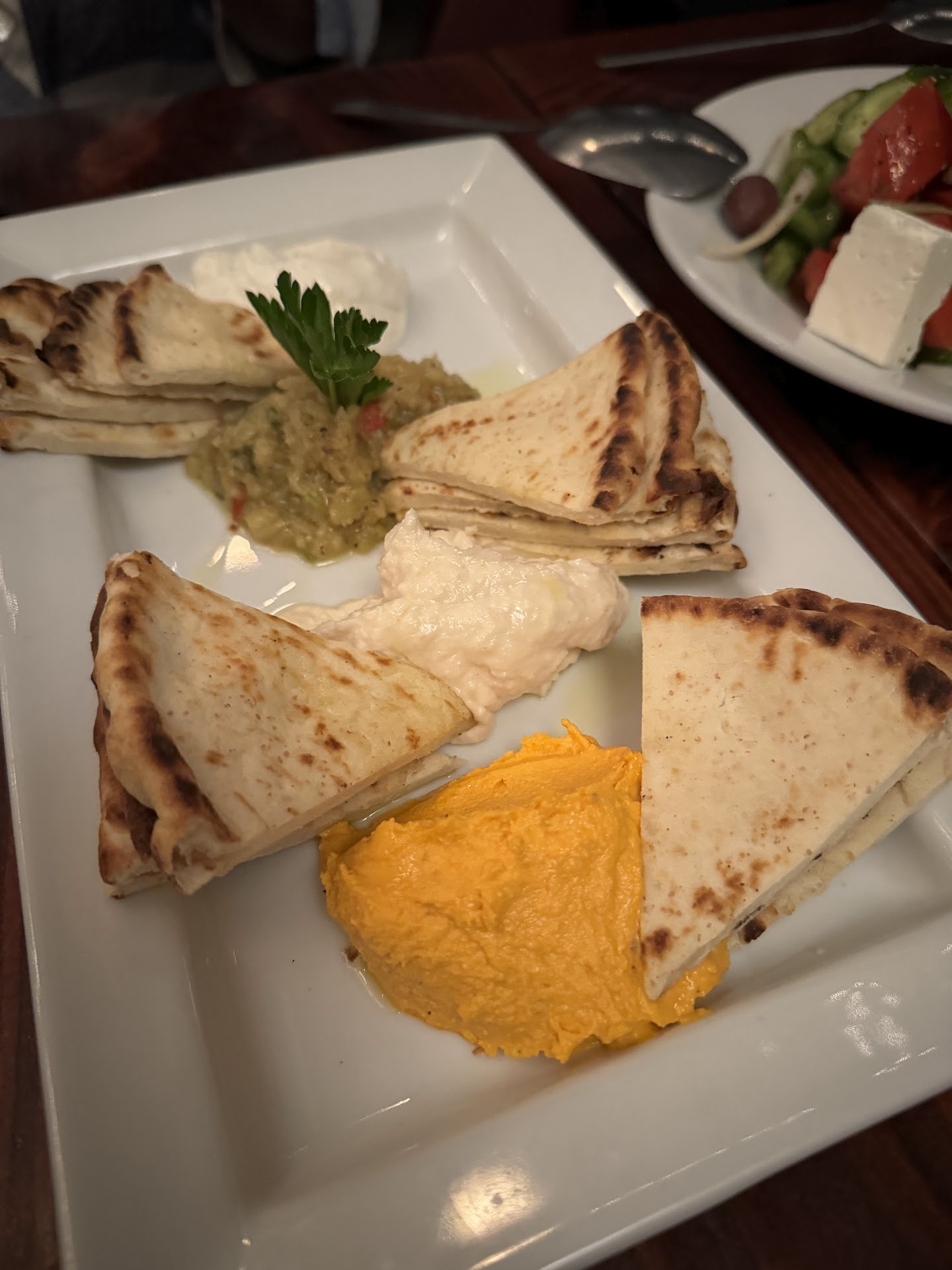 The bread was cold and flavorless. On the chewy side. The salad portion for two has decreased considerably for two. The mouruli salad is shredded lettuce and feta. Just a very small portion.
