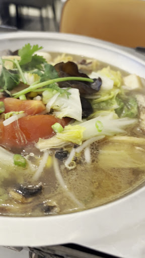The hotpot was amazing. The broth was so tangy and rich. The fresh vegetables swam on top of a layer of thin sliced and somewhat fatty beef and glass noodles. I had requested hot oil, but in reality the velveteen sauce was pungent enough to light up my taste buds.