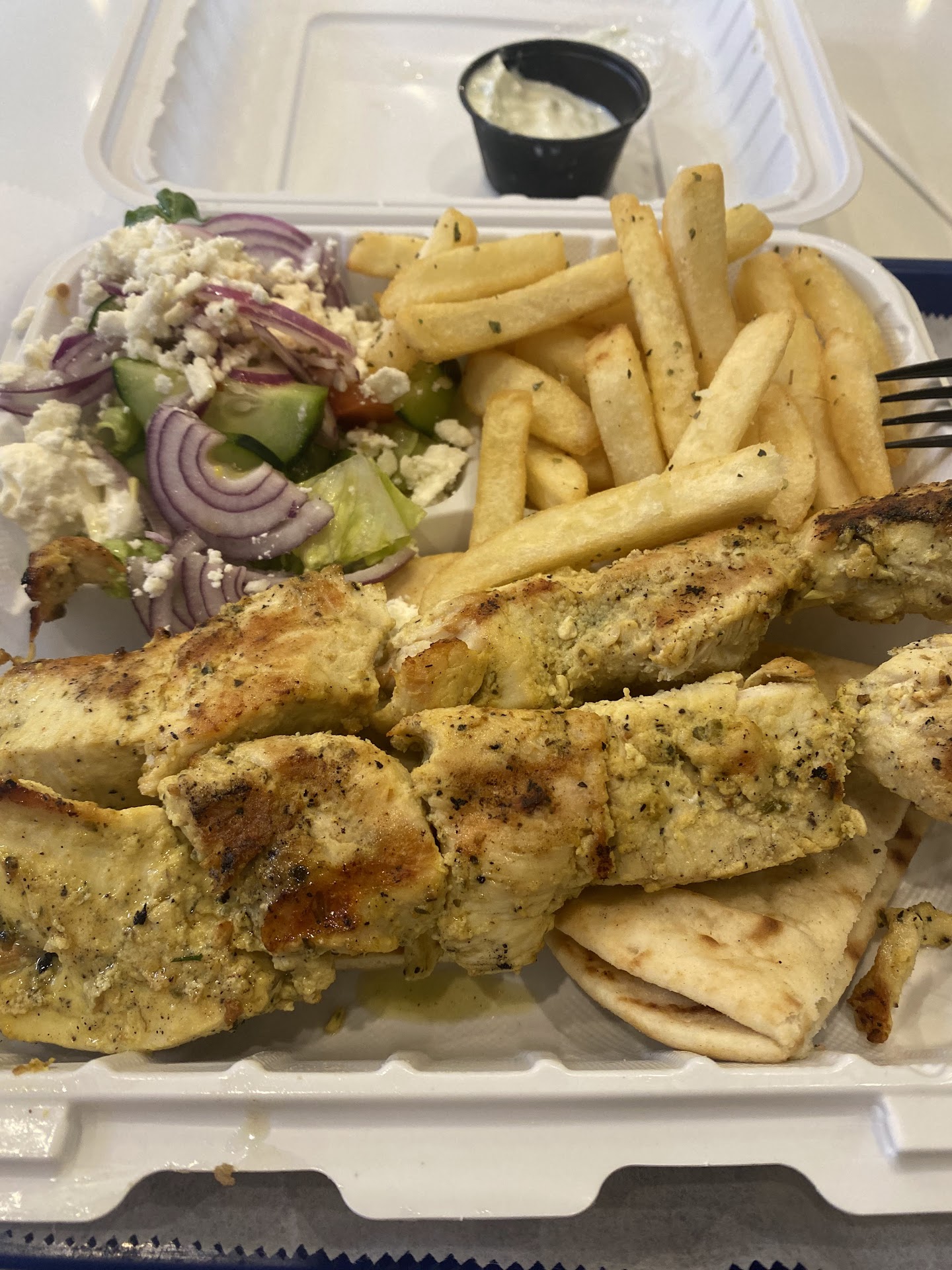 Read moreDefinitely Blah Blah PLAIN Food, not too Tasty. I ordered Greek Lemon Potatoes but instead got boiled a Long Time overcooked and mushy soft Potatoes. They were not Real Greek Lemon Potatoes which are supposed to be crunchy on the outside and taste with Lemon Flavor and not just be sprayed with Butter and be put in the Oven to be overcooked after Boiling. Sadly their on the Stick Kebabs are not cooked fresh and are tough and drier pieces of Pork, Chicken which seem to be sprayed with lots of Oil, but have lack Flavor. Even less than a year ago the same place made much better Greek Foods. Now whomever area the cooks look not Greek but just as if they came untrained from South of the Border and don't want to cook Real Greek Recipes and pay attention how Real Greek Foods should taste. The only thing which tasted ok was Pita bread. Next time even going to next door Chipotle or other Places like Panda, or Beats or even Pizza might look like a...