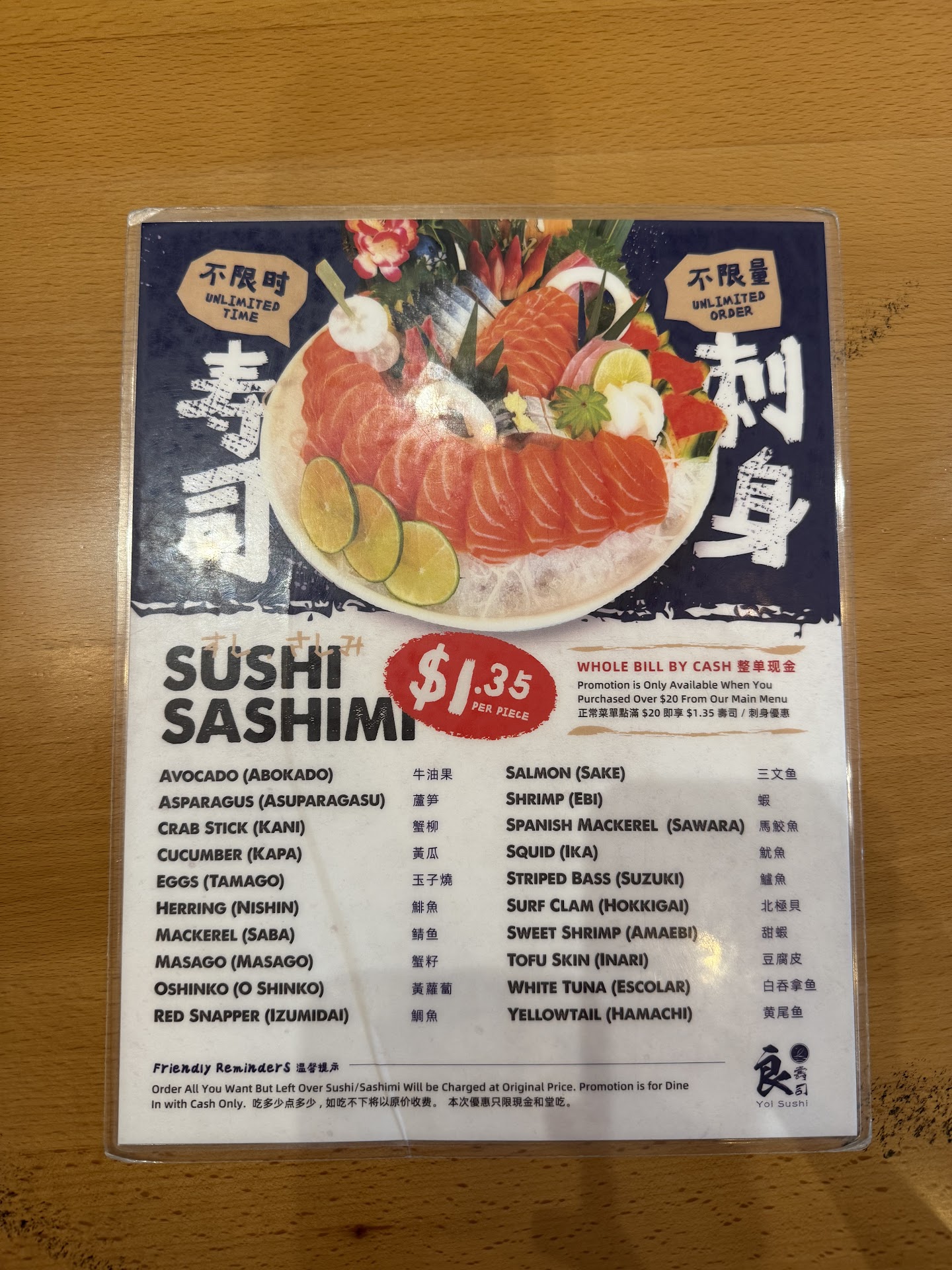 They have a cash special for sashimi that I absolutely took advantage of. I've never ordered more than a few pieces of sashimi and last night I think my receipt logged over 30. The full bill between my friend and I, with our entrees included, still came in under $90.