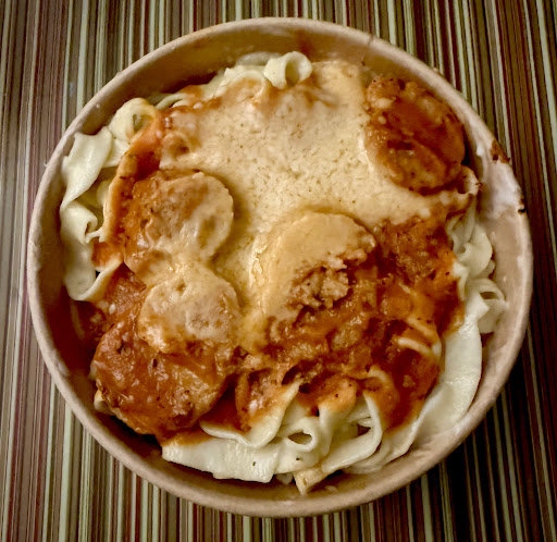 I ordered the basic fettuccine with olive oil, added some extra mushrooms, and topped it with the Yummy sauce. But the pasta felt more like something from a noodle joint in Northern China (but also much worse than those, Chinese noodles are very good actually)—soft, chewy, and kinda wrinkly, not what you’d expect from good pasta made with semolina or 00 flour. And I noticed them carrying a huge bag of all-purpose flour to the kitchen, so that explains the texture.