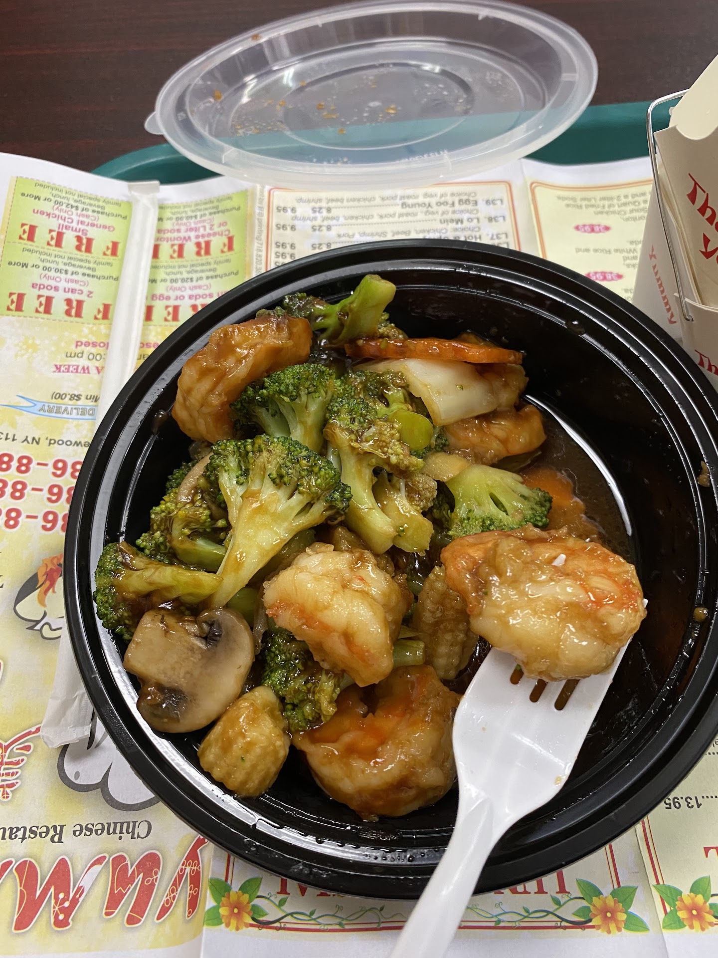 My second time (the next day), being a person that likes vegetable stir fry, I wanted to risk more so I picked from the menu ‘shrimps and mixed vegetables’. A meal with a mix of like 5 vegetables with carrots, onions and a couple of more greens and white ingredients. A fair amount of tender shrimps, the right amount of sauce in the stir fry and a cup of white rice that felt soft and warm.