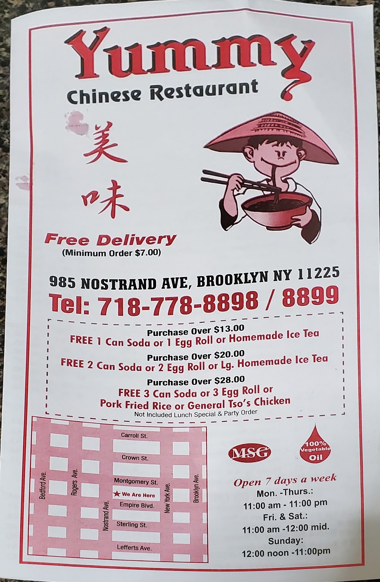2018:Restaurant clean (HUGE plus). Day I tried them, it was lunch time and they were getting a delivery. Lady taking orders juggled a lot w/telephone and walk-in customers and cooks unpacking delivery truck, but she handled everyone w/professional poise. Think my order was new for them - fried brown rice & broccoli. Food was yummy. Good portion. Will eat...