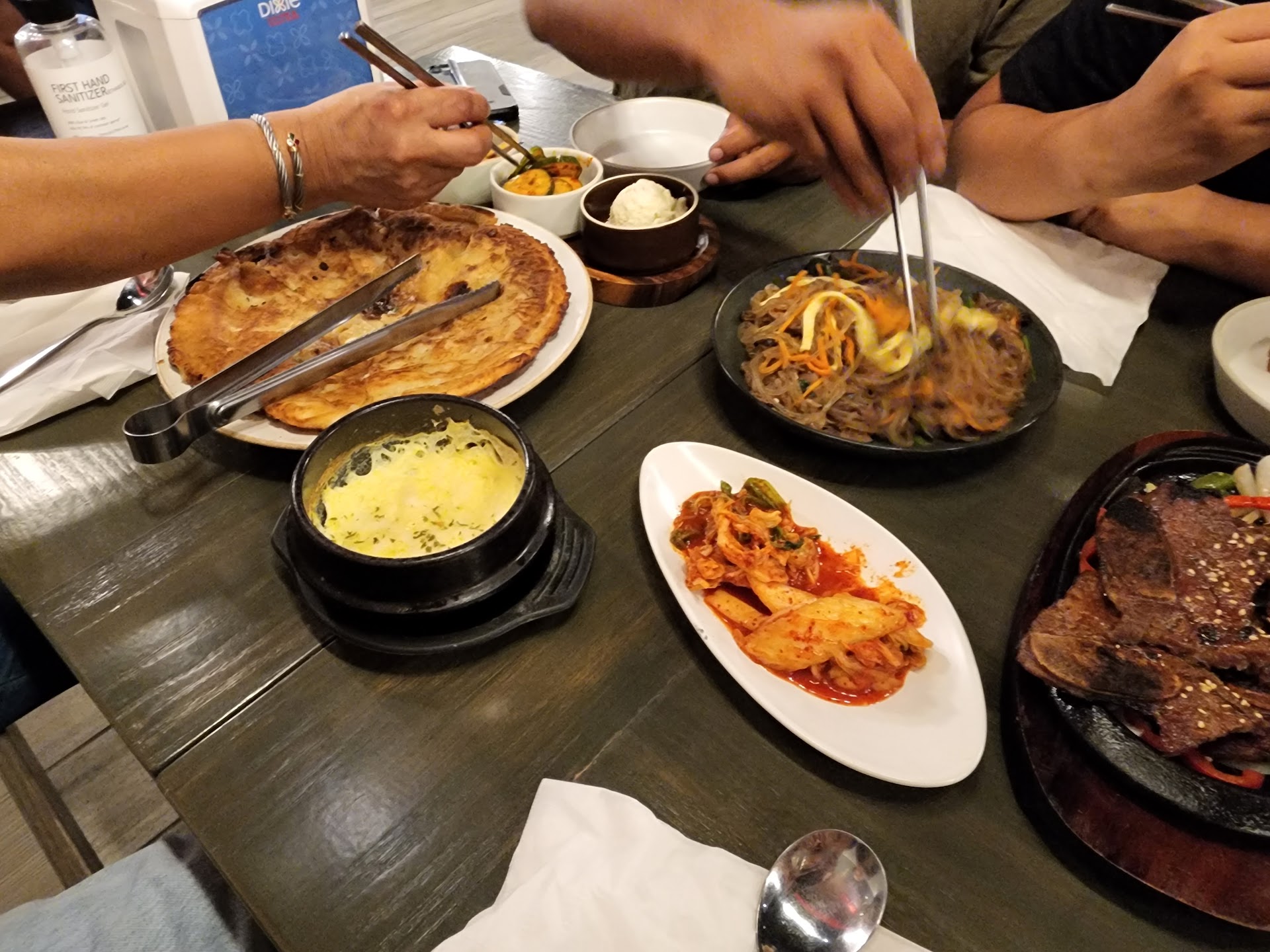 -free banchan (every Korean restaurant does this and it is free and refillable): it was okay, not the best compared to others I've had in bayside and ktown. We liked the marinated onions/jalapeños and kimchi, which tasted light and fresh (my preference). The potato salad was not good and the rest were alright but not memorable. Steamed egg had a hint of dashi stock and was decent! I will note that the service was not amazing so we had to very proactively ask for refills of our banchan a few times but don't be afraid to speak up! -appetizers: japchae was very sweet so I suggest skipping this if you're like me and not a fan of sweet noodles; rolled egg omelet was just okay, don't think I'd pay $10 for it again; kimchi pancake was good! Found myself going back for seconds. -mains: beef short ribs are a classic Korean dish and they were pretty good here. My dad thought they were tough but others in the party disagreed so perhaps some pieces were tougher than others?