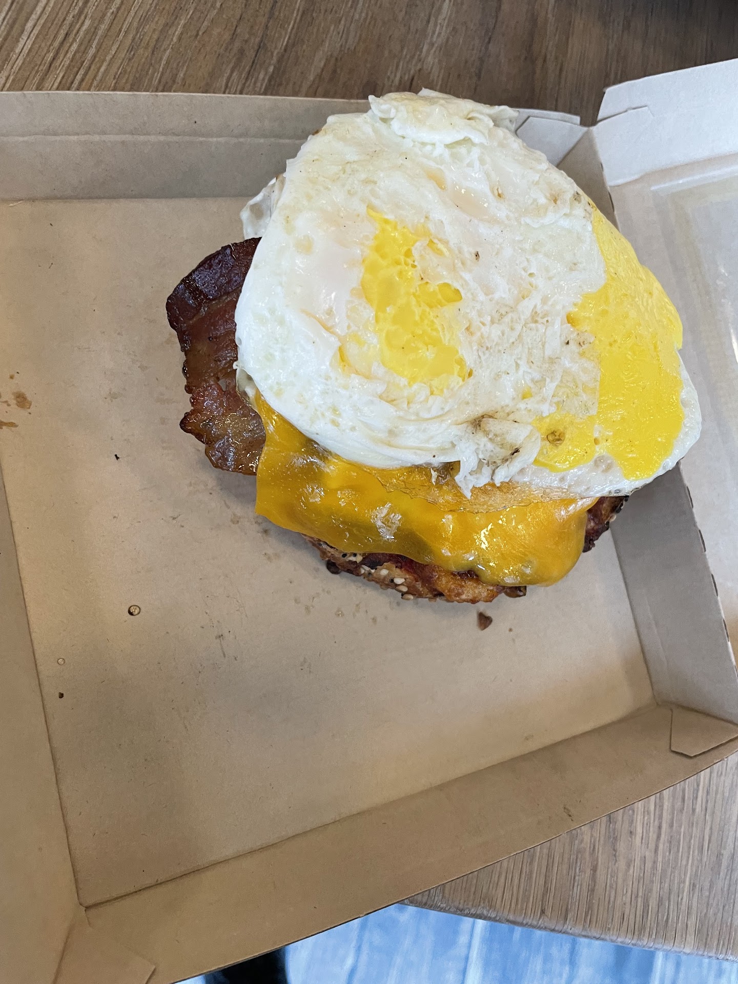 Arrived when there was no line, put in my order, and walked to the side to wait. It should’ve been a warning sign that the cashier didn’t understand what I was trying to order, and it took multiple repeats plus a point at the menu to get them to put in the order. After this, I watched as multiple people who ordered after me, take out or dine in, got their orders. I watched the person passing out orders close out a bunch of them on the touchscreen, including some people who had ordered after me, and I realized they just forgot to give me my order. The store wasn’t even busy at this point, so it was super surprising. It had been almost twenty minutes at this point, so I went to ask the cashier again. The cashier and the lady managing orders had a look at the screen and clearly did not find my order, so the cashier went to the back of the kitchen. After a while he came forward with a box and put it on the table. He opened it, looked at it, showed the manager lady, and they had a whispered discussion about it, a sure sign something was wrong, and then she wrapped it up tight and gave it to me, as if I shouldn’t open it until I got home. Shouldn’t have expected anything better—I might be wrong, but aren’t the fillings supposed to be in the bagel? How am I supposed to eat this? The bagel was also burnt, and the eggs had obviously been sitting...