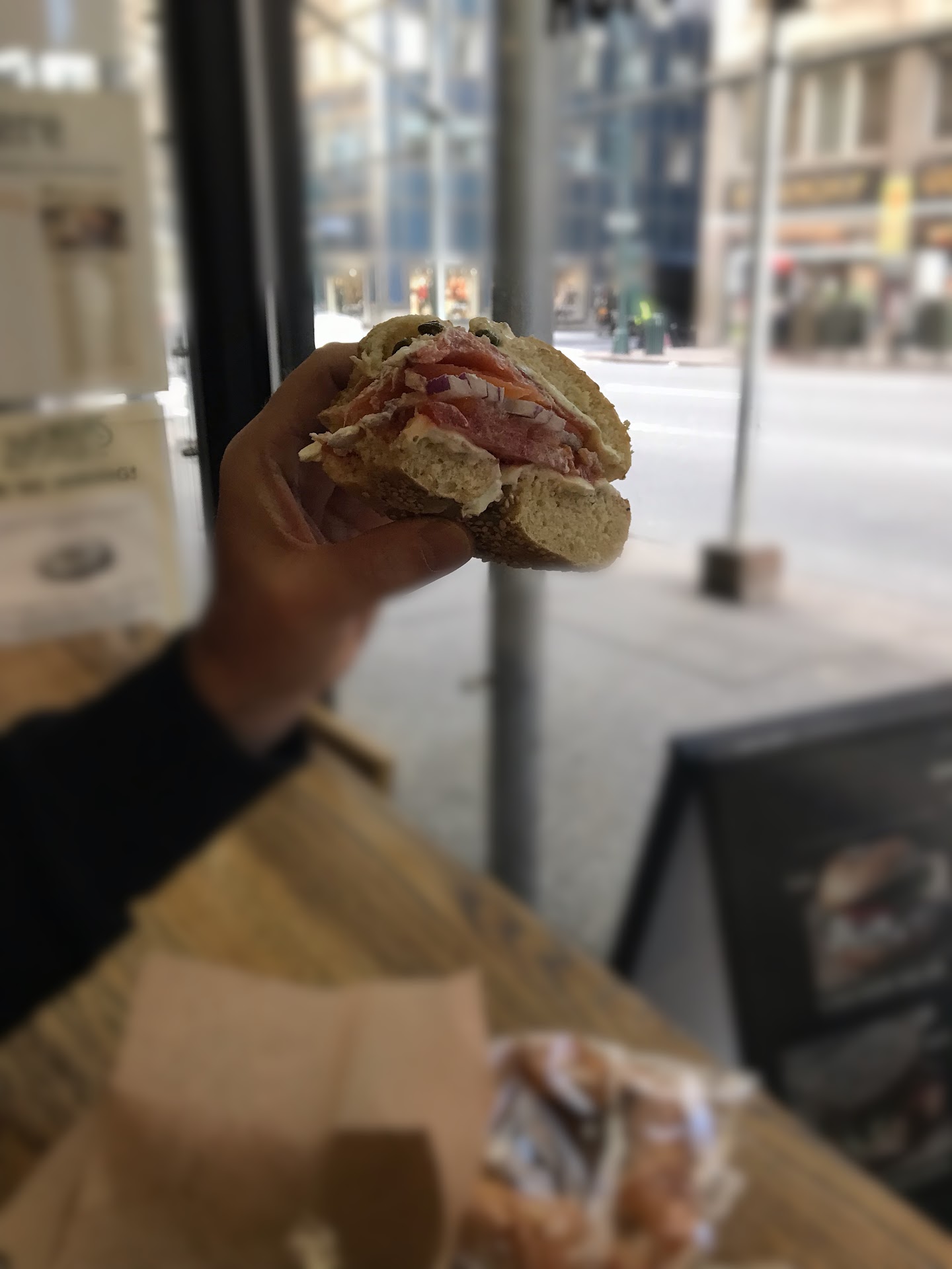 Extremely disappointing service (forgot about order and other things), mediocre bagel at best—obviously had been sitting for a while and burnt. I said yes to toasted, but not black on the bottom with the taste of ashes. Not sure what's going on with the toppings on top of the bagel.