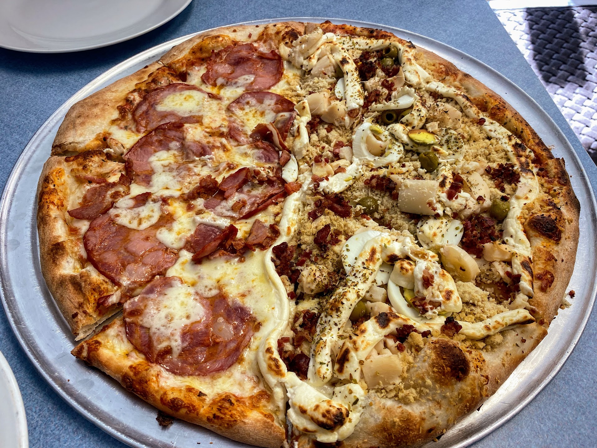 Love this pizza. When I first heard about "Brazilian Pizza" I thought, what's up with these Brazilians trying to make pizza, must be awful, leave the pizza to the Italians please! How wrong could I be, this pizza topped with every imaginable combination of vegetables and meats is the best. I went vegetarian years ago, only recently eating fish again for health reasons. The vegetarian pizza here is a meal in two slices, delicious.