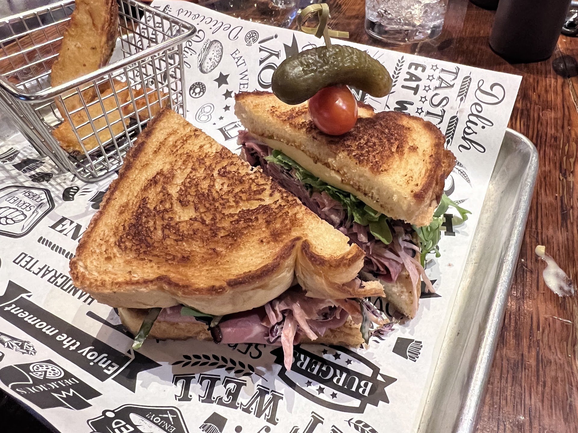 Read moreThe staff must have been having an off night or something when we were here. Decided to try it out because the food and reviews looked good but our experience was the opposite. Our server took a looooooong time to come over to us when we sat down, took our drink and food order, came back with one drink instead of two and forgot our waters we ordered, and when the food came out it was not hot. The Mac n cheese we ordered was cold cold and we asked to have it reheated. Mind you we were there on a Monday night and aside from one 10 top table, the place was completely empty. There’s no reason anything should have been forgotten or served cold. I am a waitress myself and I can tell the server we had just simply did not give a f. He was very nonchalant, and as someone who works in the food industry that really bothers me. This was the first time in my life I’ve left less than a 20% tip. The one other woman working there was very friendly and even offered to give my almost 2 year old some balloons to blow up and play with. Overall the atmosphere and interior design of the restaurant is really cool! I can imagine this being a fun spot to go to on a Friday night. My. Husband got a brisket sandwich and I got the pastrami sandwich, which was good but the Gouda that comes in it is overpowering and I eventually took it off so I could actually taste the rest of the flavors. My husband also woke up in the middle of the night throwing up and spent the next day on the toilet and he’s feeling pretty positive it...