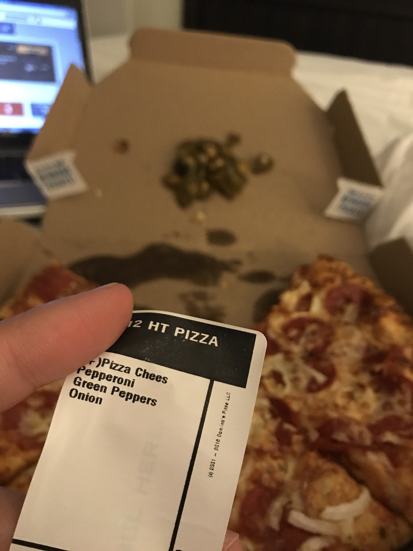 Read moreStaying at hotel. Ordered a medium pepperoni onion green pepper online. App is good. Tracking is good. Pizza shows up with jalapeños instead of green peppers. Call store. Horrible connection. They say it's their phone. Well, that's a problem. Tell them I want a partial credit. Tells me they can't. They can pick up wrong pizza and deliver new one. Already waited 35 min for first and starving. Tell them that is not an option. I can take off jalapeños. No can do they say. Then I suggest they deliver more food even though won't be hungry. Nope. Can't do that either. They can come get the bad pizza and give me a correct pizza. I hung up. Bad service. Your mistake in first place and doesn't look to be the first time according to reviews. Dominos will be on same path as Blockbuster Video - it's only a matter of time....