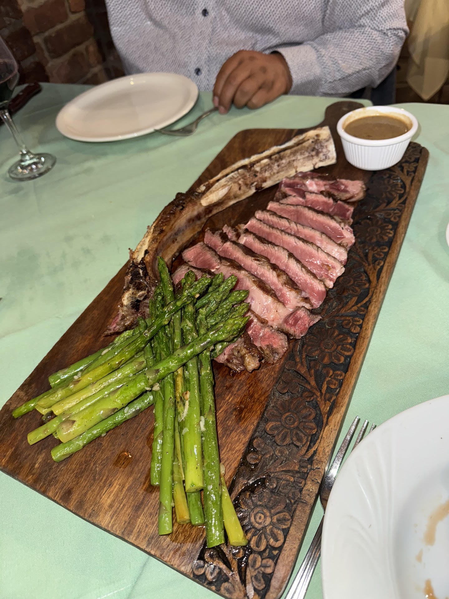 Food is overpriced for what they have. I would not mind as much if the food was delicious, but it's not. The only thing delicious is the clams with garlic sauce. The calamari is decent/good. EVERYTHING else is bland, overpriced & not worth your time nor money. Red sangria was not too sweet nor strong - easy to drink with the 1st/2nd glass. I ordered a T-bone steak ($70). It was a very cheap cut of meat with no flavor at all and VERY sinewy! I have had better steak for less. Even the Spanish rice that comes with it is tasteless. Another person ordered the crusted ahi tuna. Although presentation was nice, again it was absolutely bland. Someone else ordered the porterhouse ($93). It didn't look like 32 oz & again absolutely bland! I've ordered a lot of steak in NYC, NJ and California (Gallaghers, Delmonico's, Camines, Shadow on the Hudson, Del Frisco's, etc) for MUCH better and with no qualms about spending money on good food. Skip this place.