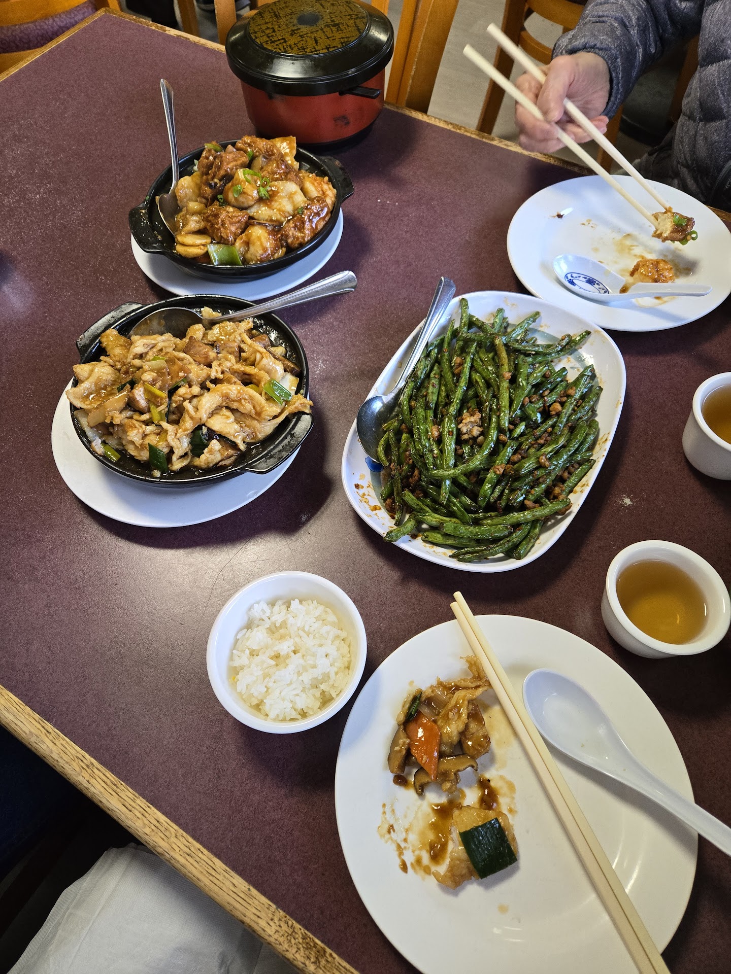 For 3 people we had the spicy green beans with ground pork, the seafood tofu claypot, and the taro root chicken claypot. The first that arrives after ordering is the soup. On this day, it is corn and egg flower soup. A nice and light soup to stimulate the appetite. The green beans came out next. Fresh from a very hot wok it had great flavor. It was hard to stop eating it once you start and it's especially good accompaniment with white rice. The claypots took a little bit longer, but worth the little bit of wait. Both had flavorful vegetables (cabbage, carrots, etc) on the bottom. The seafood one had big chunks of cod, shrimp, fish paste, and fried tofu. The taro chicken pot had big slices of chicken, taro, shitaki mushrooms. Both had deep flavor without being too salty.