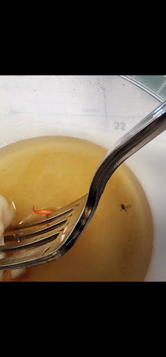 Today, I put the soup in the microwave. Pull off the lid and begin drinking the broth. To my surprise, there's a Gnat in the soup 🥺 This was my first time opening it since leaving the restaurant.